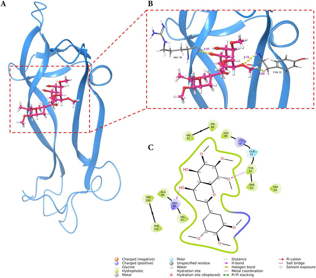 Figure 9. Molecular docking of GarA with BDNF protein where (A). Ribbon representation of the BDNF protein (blue) with the docked GarA (pink) situated in the hydrophobic binding cavity, (B). Zoomed-in view of the binding site showing key hydrogen bonding interactions between the ligand and active site residues including TYR52 and ARG88. Distances (in Å) represent favourable hydrogen bonding geometry, and (C). 2D ligand interaction diagram, illustrating hydrogen bonds, hydrophobic contacts, and surrounding residues.
