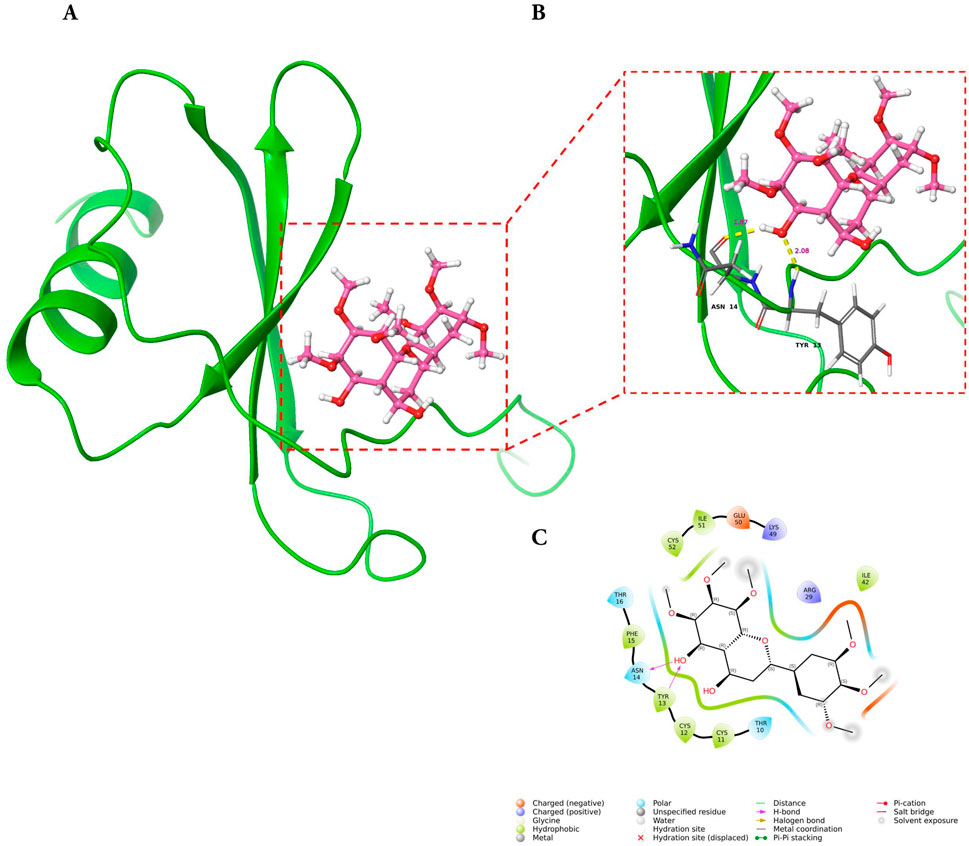 Figure 11. Molecular docking of GarA with MCP-1 protein where (A). Ribbon representation of the MCP-1 protein (green) with the docked GarA (pink) situated in the hydrophobic binding cavity, (B) Zoomed-in view of the binding site showing key hydrogen bonding interactions between the ligand and active site residues including TYR13, and ASN14. Distances (in Å) represent favourable hydrogen bonding geometry, and (C). 2D ligand interaction diagram, illustrating hydrogen bonds, hydrophobic contacts, and surrounding residues.