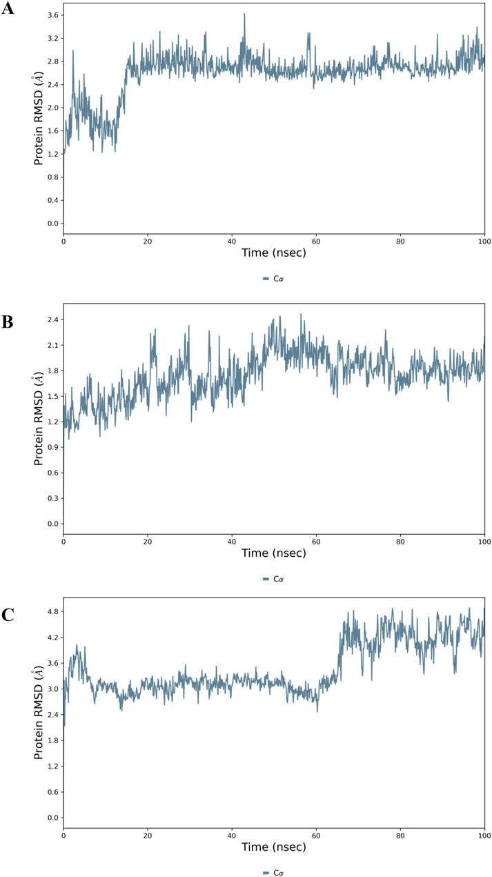 Figure 12. Molecular dynamics simulation analysis of the top docked complexes where Protein RMSD plot showing the stability of the: (A) BDNF; (B) IL-6 and (C) MCP-1 backbone (Cα atoms) over a 100 ns MD simulation.