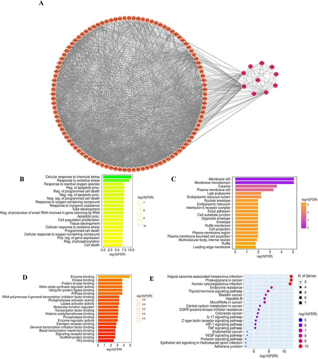 Figure 14. (A) Merged Network of GarA target genes and core tight junction genes; (B) Graph of the Biological process involved in GO enrichment; (C) Cellular components graph of GO enrichment; (D) Molecular function graph of GO enrichment; (E) KEGG enriched graph for determination of pathways associated with GarA in the treatment of ethanol induced brain damage.