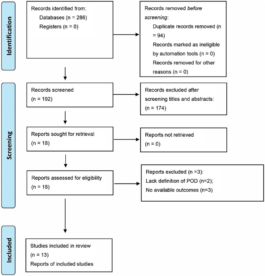 A systematic search identified 286 potential records as of 30 June 2025. After removing 94 duplicate records, 174 were excluded based on title and abstract screening. The remaining 18 studies underwent full-text review, resulting in exclusions based on the PICOS criteria: three studies lacked adequate outcome reporting (Bornemann-Cimenti et al., 2016; Lu et al., 2024; Ye et al., 2024); and two failed to define POD (n = 2) (Chen et al., 2022; Han et al., 2023). Ultimately, 13 RCTs were included in the synthesis (Zhao et al., 2025; Zhang Y. et al., 2024; Jing et al., 2024; Zhang C. L. et al., 2024; Huang et al., 2024; Ju et al., 2025; Li et al., 2022; Liu et al., 2024; Liu et al., 2023; Luo et al., 2024; Ma et al., 2024; Ma J. et al., 2023; Xiong et al., 2024), with the selection process detailed in the PRISMA 2020 flowchart (Figure 1).