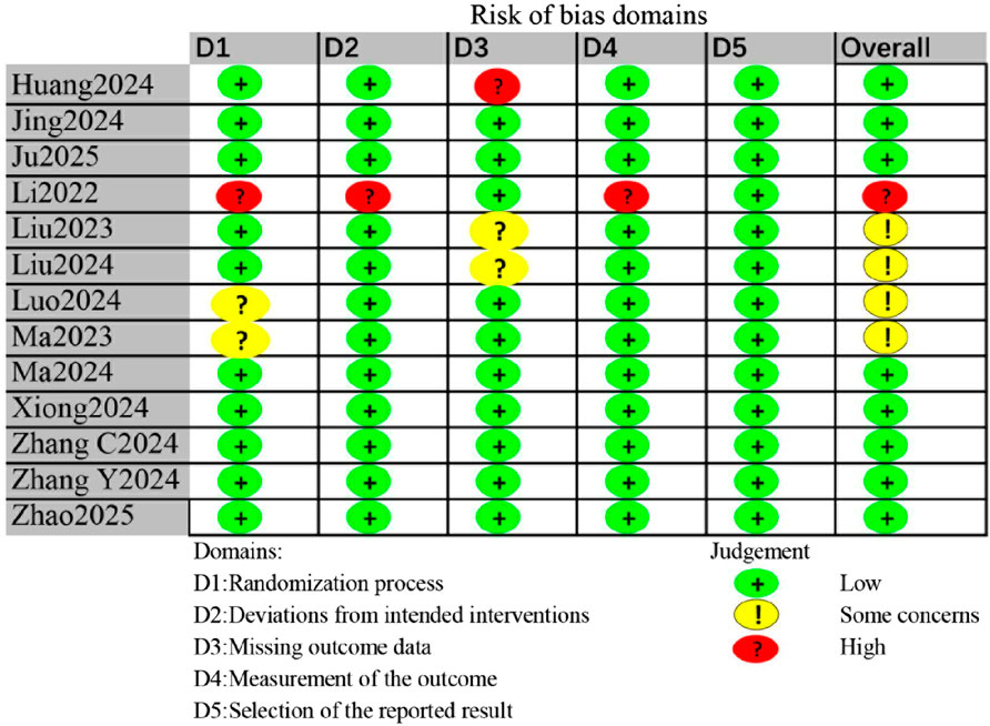 Risk of bias assessment for individual studies is shown in Figure 2. Three studies were judged as having some concerns or high risk due to issues in the randomization process (Li et al., 2022; Luo et al., 2024; Ma et al., 2024). One study had high risk in the domain of deviations from intended interventions (Li et al., 2022). Among the included studies, the primary concerns regarding risk of bias arose in the domain of measurement of the outcome. Since POD assessment using CAM or CAM-ICU can be subjective, one study that did not explicitly report blinding of the outcome assessor was rated as having high risk in this domain (Li et al., 2022). Of the included trials, eight were classified as low risk of bias, four raised some concerns, and one was considered high risk.