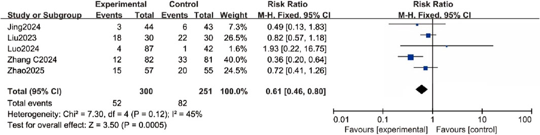 Five trials assessed the incidence of PONV, and the results showed a significantly lower incidence in the esketamine group (RR = 0.61, 95% CI [0.46, 0.80], P < 0.05, I2 = 45%, Figure 4), with low heterogeneity.