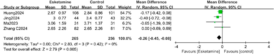 Four studies reported postoperative pain scores within 24 h. The forest plot indicated a significantly lower pain score in the esketamine group (MD = −0.26, 95% CI [-0.45, −0.08], P < 0.05, I2 = 0%, Figure 5), with low heterogeneity.