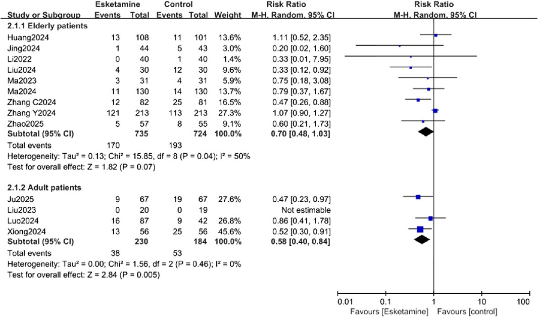 In our analysis, a random-effects model revealed that esketamine significantly reduces POD, though with high heterogeneity. Subgroup analyses explored potential sources of this heterogeneity. Unfortunately, heterogeneity did not decrease in these analyses. Notably, esketamine significantly reduced POD in the adult subgroup, but not in the elderly subgroup. It also decreased POD in the cardiac surgery subgroup but showed no effect in the non-cardiac surgery subgroup. The subgroup analyses suggesting greater benefit in adults and cardiac surgery patients are exploratory findings based on a small number of trials. They should be viewed as generating hypotheses for future research rather than as conclusive evidence of differential effects.