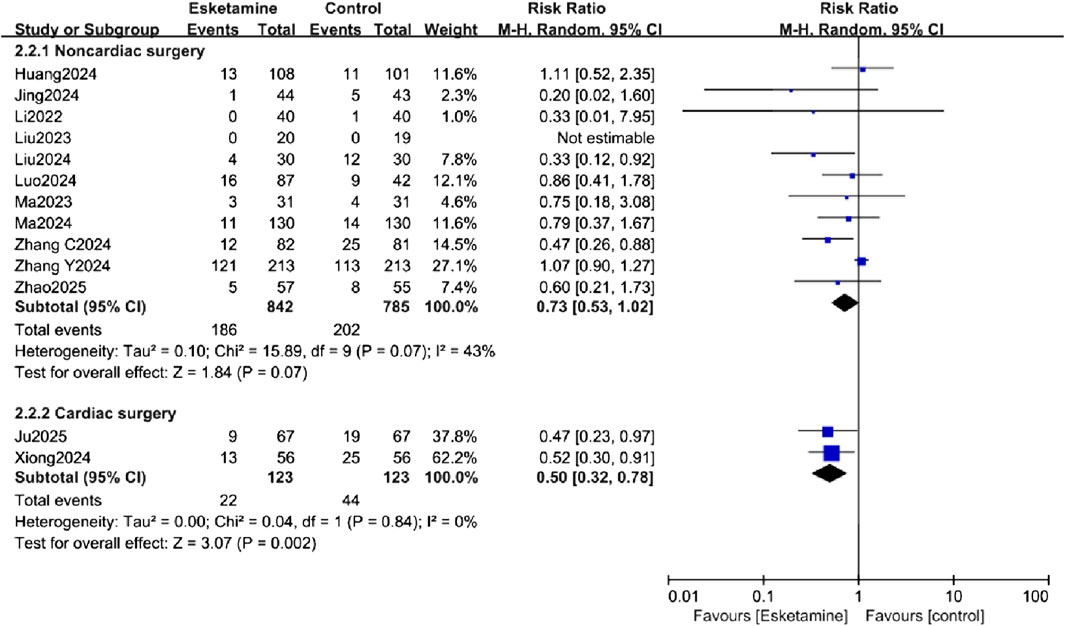 Results: Thirteen RCTs involving 1,873 elective surgery patients under general anesthesia were included. Esketamine administration was associated with a lower POD incidence (RR: 0.66; 95% CI: 0.49–0.91; P < 0.05). Subgroup analyses revealed potentially significant reductions in adult populations and cardiac surgery cohorts. The postoperative nausea and vomiting (PONV) rate decreased in the esketamine group. Additionally, esketamine was associated with reduced pain scores at 24 h postoperatively.