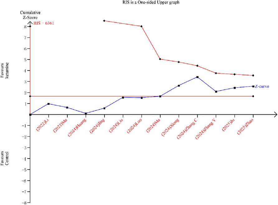 Although the cumulative z-curve crossed the traditional boundary, it did not reach the required information size (RIS) line or the TSA monitoring boundary, indicating that the sample size is insufficient for firm conclusions (Figure 9).