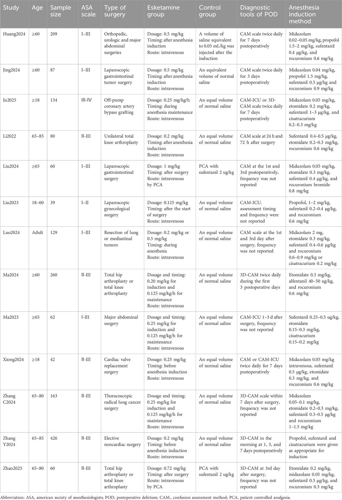 The 13 RCTs included 1,873 participants, with 965 in the esketamine group and 908 in the control group. These studies were published between 2022 and 2025, with sample sizes ranging from 39 to 209. All studies were conducted in China. Detailed characteristics of the included RCTs are presented in Table 1.