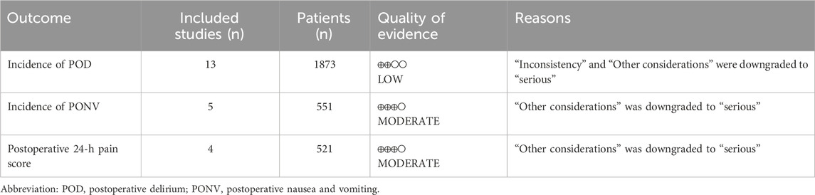 Our meta-analysis assessed the quality of evidence regarding the impact of esketamine on POD, pain, and PONV using the GRADE approach. The evidence for POD was rated as low, while the evidence for PONV and postoperative 24-h pain scores was rated as moderate. A summary of the GRADE evaluation is presented in Table 2.