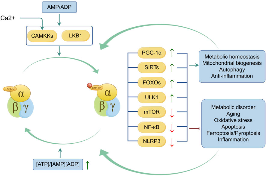 Figure 1. Mechanism and regulation of AMPK activation. LKB1 and CAMKKs (when facilitating Ca2+ entry into cells) are involved in the phosphorylation of AMPK, a process induced by the ATP-to-AMP or ATP-to-ADP ratio. Activation of AMPK and its downstream proteins of AMPK, including Peroxisome proliferator-activated receptor γ coactivator 1α (PGC-1α), Sirtuins(SIRTs), Forkhead box Os (FOXOs), Unc-51-like autophagy activating kinase 1(ULK1), mammalian target of rapamycin(mTOR), nuclear factor-kappa B(NF-κB) and Nod-like receptor protein 3 (NLRP3) improve metabolic homeostasis, mitochondrial biogenesis, autophagy and anti-inflammation and inhibit metabolic disorder, aging, oxidative stress, apoptosis, ferroptosis, pyroptosis and inflammation. Conversely, the activities improved by AMPK signaling help the phosphorylation of AMPK, and the inhibited activities suppress the activation of AMPK. The green line indicates promotion, and the red line indicates suppression. ↑ signifies an increase, while ↓ signifies a decrease.