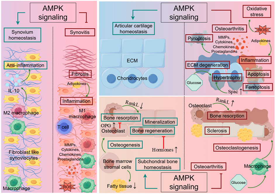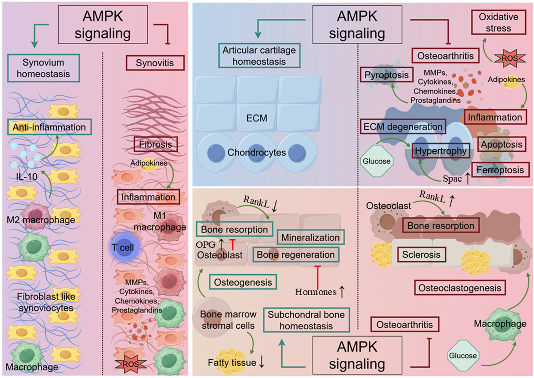 The important role of AMPK in maintaining tissue homeostasis within joints highlights its potential as a therapeutic target for OA. Experimental studies have demonstrated that enhancing AMPK signaling can alleviate OA progression, and therapies targeting AMPK signaling are under development.