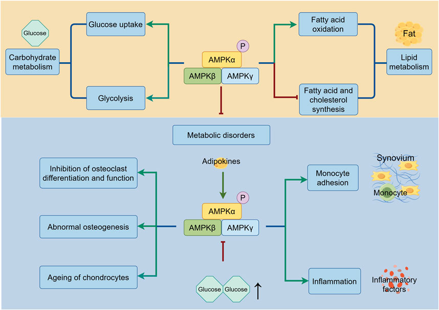 Figure 3. The regulation of AMPK in metabolism. Under the metabolism homeostasis, AMPK regulates carbohydrate metabolism by improving glucose uptake and glycolysis, and lipid metabolism by increasing fatty acid oxidation and lowering fatty acid and cholesterol synthesis. During the metabolic disorders, AMPK promotes monocyte adhesion and inflammation induced by adipokines. Suppression of AMPK caused by hyperglycemia leads to inhibition of osteoclast differentiation and function, abnormal osteogenesis and ageing of chondrocytes. The green line indicates promotion, and the red line indicates suppression.↑ signifies an increase.