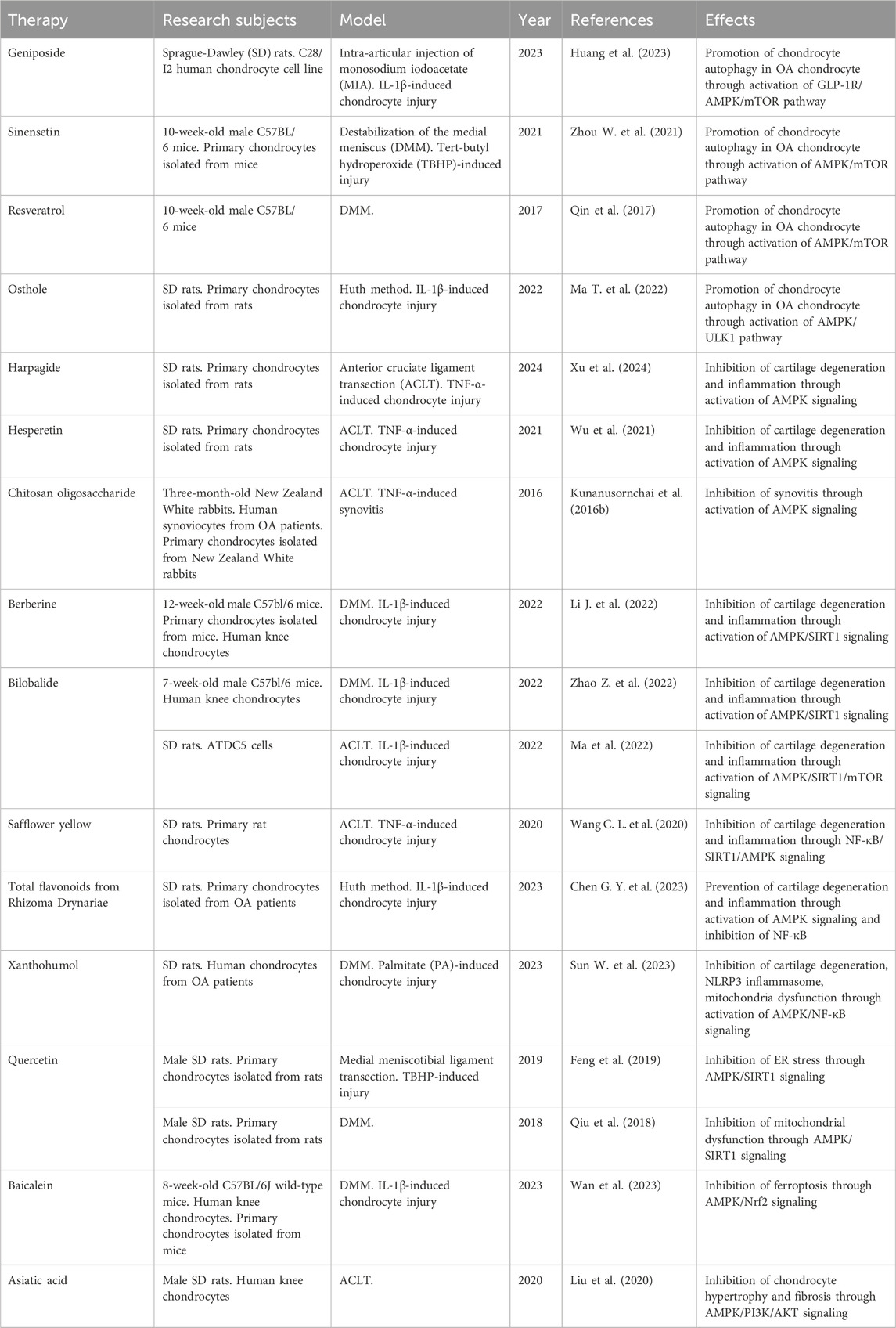 The anti-inflammatory effects of natural medicines have been used to alleviate OA progression. Harpagide (an iridoid glycoside natural molecule from the root of Harpagophytum procumbens var. sublobatum (Engl.)), Hesperetin (a natural flavonoid from the Citrus L.) and Chitosan oligosaccharide (COS, an oligomer of d-glucosamine) have been found to suppress the expression of inflammatory cytokines and MMP, thereby protecting cartilage from damage and abnormal proliferation, improving synovitis, inhibiting osteophyte formation and attenuating pain through AMPK signaling (Xu et al., 2024; Wu et al., 2021; Kunanusornchai et al., 2016b). Further investigation revealed that these effects are regulated by the activation of AMPK and its downstream signaling pathways. For example, SIRT1 signaling could be regulated by Berberine (an isoquinoline alkaloid extracted from plants) and Bilobalide (a lactone extracted from Ginkgo biloba) (Li J. et al., 2022; Zhao Z. et al., 2022; Ma et al., 2022). NF-κB signaling was inhibited by Safflower yellow (an active ingredient of Carthamus tinctorius L.), total flavonoids from Rhizoma Drynariae (the main active ingredients from the dried rhizome of Davallia mariesii T. Moore ex Baker) (Wang C. L. et al., 2020; Chen G. Y. et al., 2023). And NLRP3 inflammasome pathway was suppressed by Xanthohumol (Sun W. et al., 2023).
