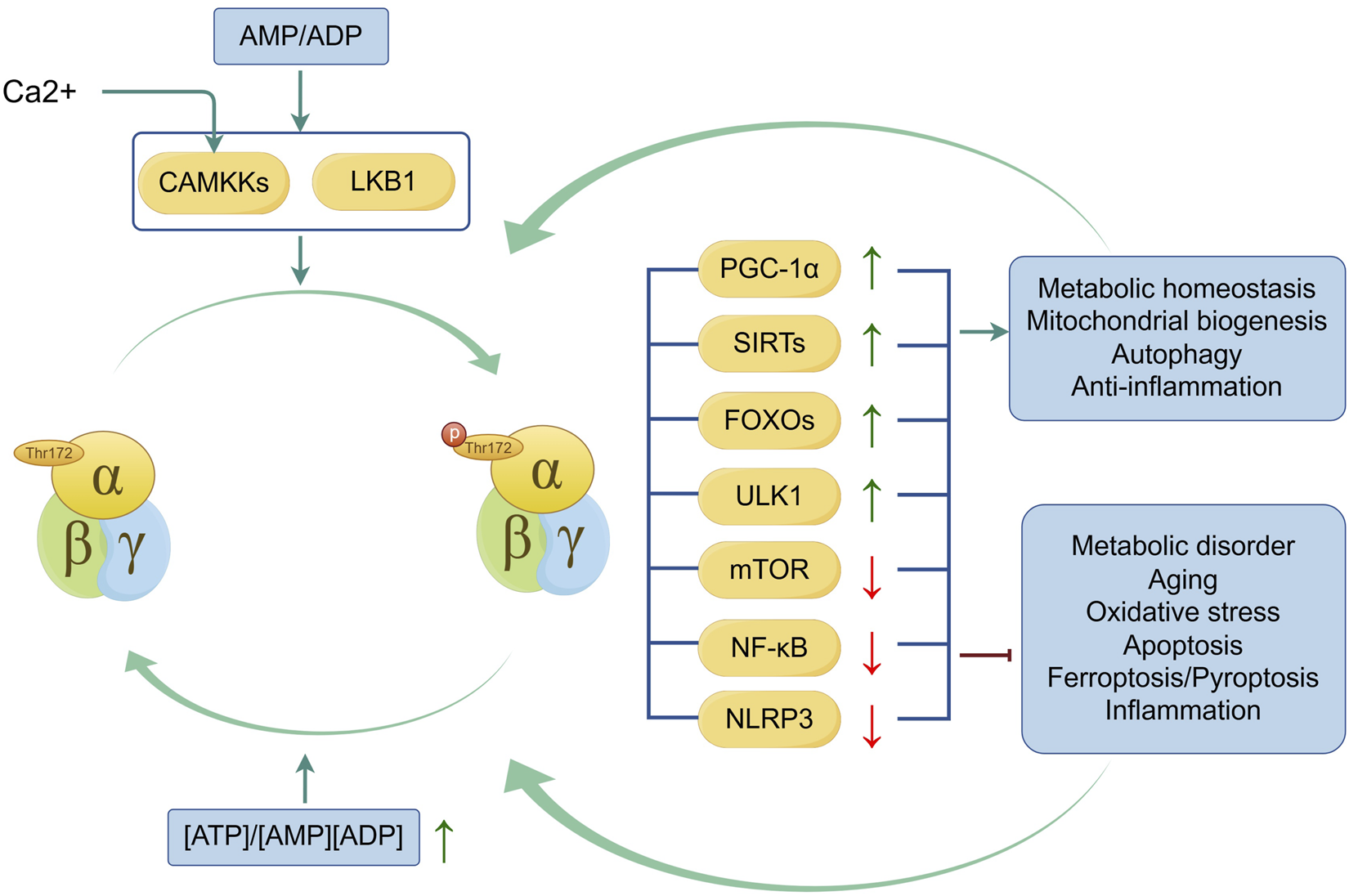 Mechanism and regulation of AMPK activation. LKB1 and CAMKKs (when facilitating Ca2+ entry into cells) are involved in the phosphorylation of AMPK, a process induced by the ATP-to-AMP or ATP-to-ADP ratio. Activation of AMPK and its downstream proteins of AMPK, including Peroxisome proliferator-activated receptor γ coactivator 1α (PGC-1α), Sirtuins(SIRTs), Forkhead box Os (FOXOs), Unc-51-like autophagy activating kinase 1(ULK1), mammalian target of rapamycin(mTOR), nuclear factor-kappa B(NF-κB) and Nod-like receptor protein 3 (NLRP3) improve metabolic homeostasis, mitochondrial biogenesis, autophagy and anti-inflammation and inhibit metabolic disorder, aging, oxidative stress, apoptosis, ferroptosis, pyroptosis and inflammation. Conversely, the activities improved by AMPK signaling help the phosphorylation of AMPK, and the inhibited activities suppress the activation of AMPK. The green line indicates promotion, and the red line indicates suppression. ↑ signifies an increase, while ↓ signifies a decrease.