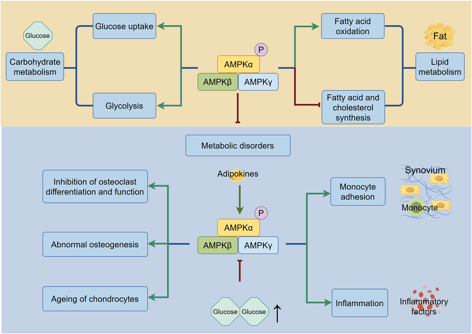 The regulation of AMPK in metabolism. Under the metabolism homeostasis, AMPK regulates carbohydrate metabolism by improving glucose uptake and glycolysis, and lipid metabolism by increasing fatty acid oxidation and lowering fatty acid and cholesterol synthesis. During the metabolic disorders, AMPK promotes monocyte adhesion and inflammation induced by adipokines. Suppression of AMPK caused by hyperglycemia leads to inhibition of osteoclast differentiation and function, abnormal osteogenesis and ageing of chondrocytes. The green line indicates promotion, and the red line indicates suppression.↑ signifies an increase.