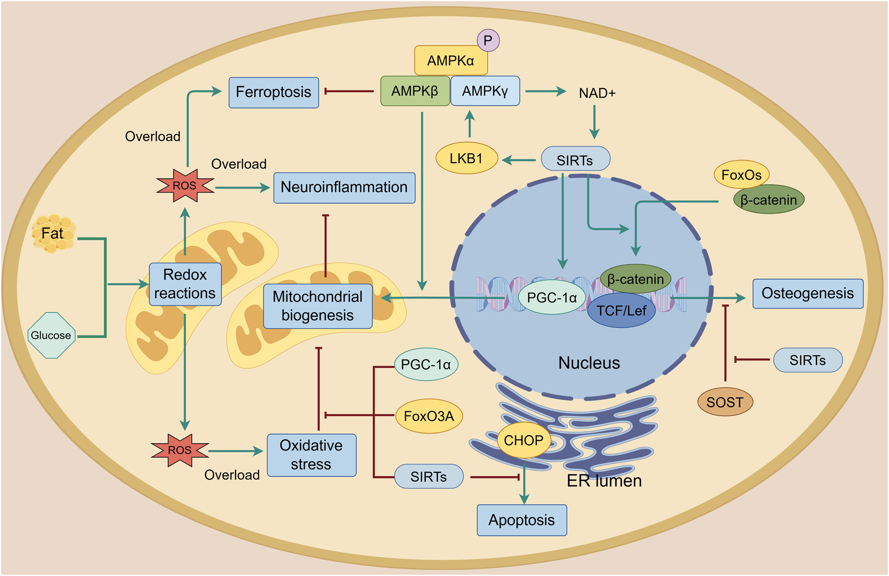 Mitochondrial biogenesis and oxidative stress in the joint. Reactive oxygen species (ROS) are produced during lipid and glucose metabolism. When there is an overload, mitochondrial biogenesis is damaged, resulting in oxidative stress, ferroptosis, neuroinflammation and apoptosis. AMPK and its downstream targets including PGC-1α, SIRTs and FoxO3A protect mitochondrial biogenesis from oxidative stress and enhance it. AMPK activates SIRTs by increasing cellular NAD+ levels. SIRTs can also phosphorylate AMPK through LKB1 to form a positive feedback loop that improves mitochondrial biogenesis. Additionally, the AMPK-SIRT signaling pathway inhibits apoptosis by reducing CHOP levels and improves osteogenesis by protecting β-catenin from sclerostin (SOST) and FoxOs. The green line indicates promotion, and the red line indicates suppression.