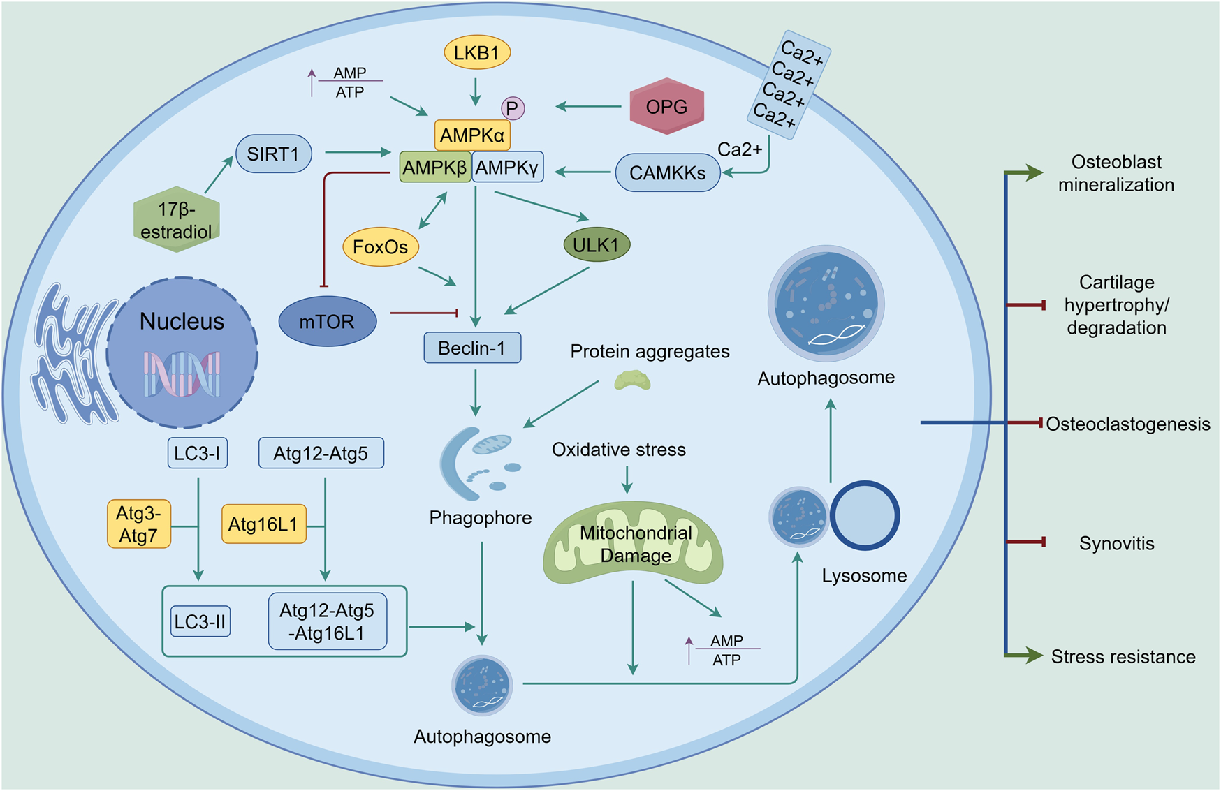 AMPK-mediated autophagy in the joint. Upon activation by increased AMP-to-ATP ratio, LKB1, CAMKKs, or OPG, AMPK signaling promotes autophagy through upregulation of Beclin-1, with ULK1, SIRT1, FoxOs, and mTOR playing key roles in the process. With the assistance of Atg3 and Atg7, LC3-I is converted to LC3-II. The Atg12-Atg5 complex binds to Atg16L1 to form the Atg12-Atg5-Atg16L1 complex. Through the involvement of LC3-II and the Atg12-Atg5-Atg16L1 complex, the phagophore matures into an autophagosome. Damaged mitochondria resulting from oxidative stress are engulfed by the autophagosome and subsequently degraded by lysosomes. Autophagy exerts its effects in joints by inhibiting cartilage degradation, synovitis, and osteoclastogenesis, while enhancing stress resistance and osteoblast mineralization. The green line indicates promotion, and the red line indicates suppression. ↑ signifies an increase.