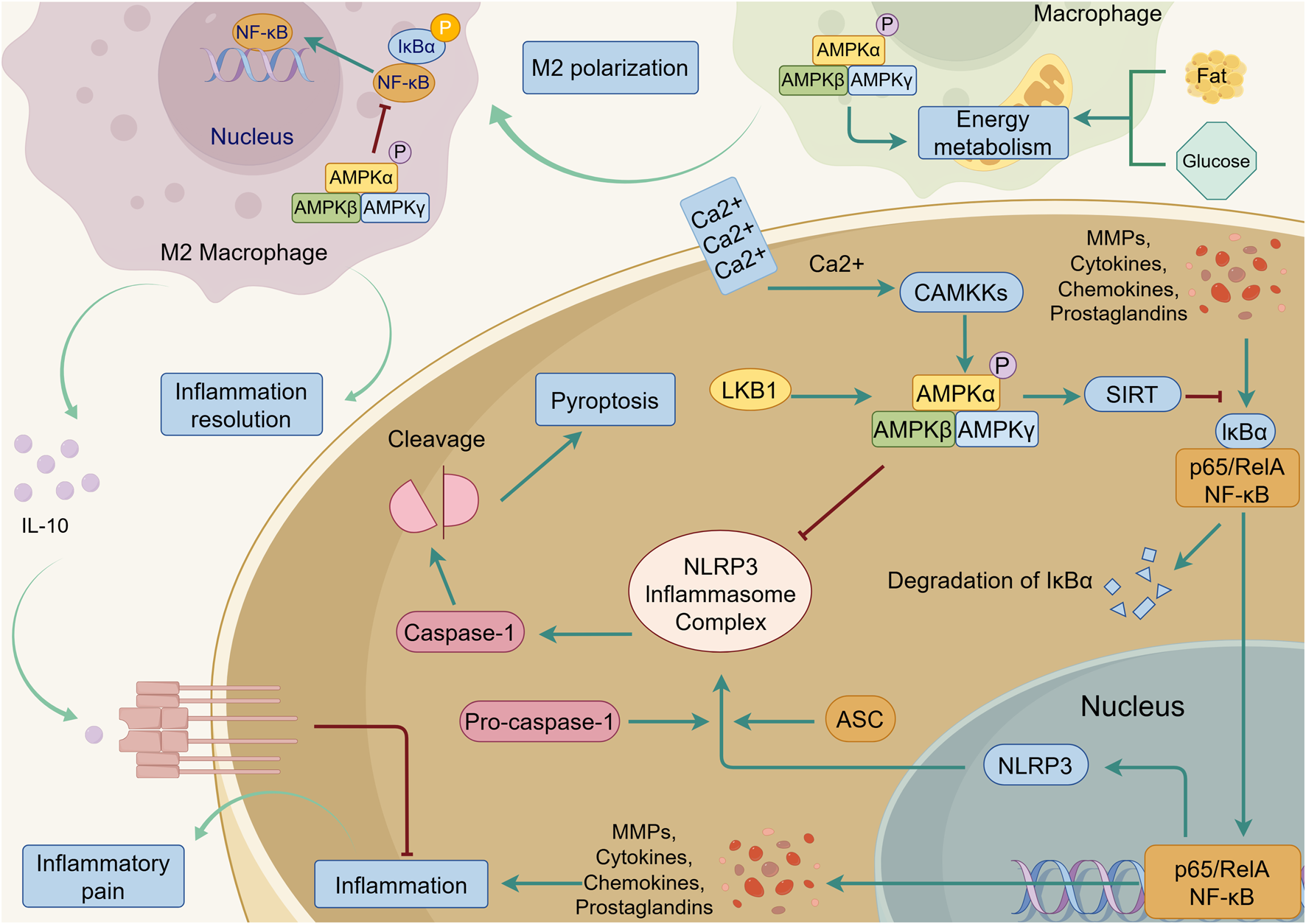 AMPK-mediated anti-inflammation in the joint. Upon activation by LKB1 and CAMKKs, AMPK inhibits NF-κB signaling triggered by MMPs, cytokines, chemokines, and prostaglandins, and suppresses the secretion of these inflammatory factors. NF-κB signaling promotes the assembly of nod-like receptor protein 3 (NLRP3), ASC, and pro-caspase-1 into the NLRP3 inflammasome complex. This complex activates caspase-1, which subsequently induces pyroptosis. AMPK signaling can effectively inhibit this process. In macrophage, AMPK promotes M2 polarization by regulating energy metabolism of fat and glucose. The M2 macrophage can secrete anti-inflammatory factors such as Interleukin-10 (IL-10), which suppresses inflammation and alleviates Inflammatory pain. The green line indicates promotion, and the red line indicates suppression.