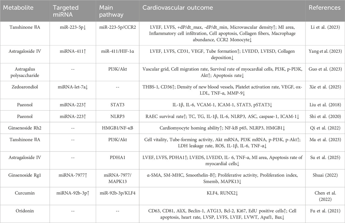 Medicinal plant-derived metabolites, especially those derived from herbal medicines, such as terpenoids, polyphenols, polysaccharides, alkaloids, and other compounds, also exhibit multi-pathway and multi-target characteristics when exerting their effects. Numerous studies have shown that these medicinal plant-derived metabolites can modulate exosomal miRNAs, thereby achieving stable cellular phenotypes, anti-inflammatory effects, and enhanced cellular antioxidant capacity in the treatment of cardiovascular diseases (Shi et al., 2020; Fu et al., 2021; Yang et al., 2024). This review will conduct a comprehensive analysis of both in vivo and in vitro experiments, and summarize the research progress on the medicinal plant-derived metabolites that regulate exosome miRNA expression or cooperate with exosomes in the treatment of CVD.