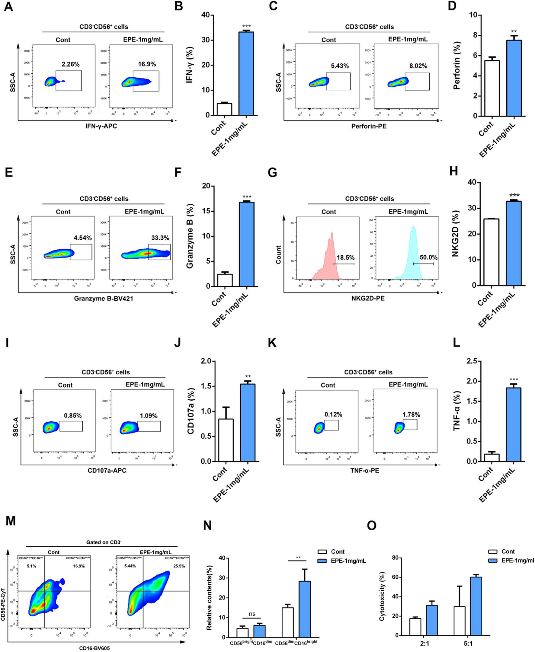EPE activates human primary NK cell. (A–H) Flow-cytometry analysis of the production of IFN-γ (A), Perforin (C), Granzyme B (D) and NKG2D (G) and the quantification of IFN-γ (B), Perforin(D), Granzyme B (F) and NKG2D (H) in human primary NK cell un-treated or treated with EPE (1 mg/mL) for 18 h followed by an additional 6 h treatment with 1 μg/mL monensin solution. (I) Flow-cytometry analysis of the production of CD107a in human primary NK cell untreated or treated with EPE (1 mg/mL) for 24 h, following co-cultured with K562 cells for 4 h. (J) The quantification of CD107a. (K) Flow-cytometry analysis of the production of TNF-α in human primary NK cell. (L) The quantification of TNF-α. (M,N) Flow-cytometry analysis of the production of CD56brightCD16dim and CD56dimCD16bright cells and the quantification of CD56brightCD16dim and CD56dimCD16bright cells in human primary NK cell un-treated or treated with EPE (1 mg/mL) for 18 h followed by an additional 6 h treatment with 1 μg/mL monensin solution. (O) Cytotoxicity of NK cell untreated or treated for 24 h with (1 mg/mL) and incubated for 4 h with K562 cells (effector: target = 2:1 or 5:1) was measured by Calcein-AM assay. Cytotoxicity (%) = 100×(maximum release−spontaneous release)/(experimental fluorescence−spontaneous release). Data are represented as mean ± SEM. n = 3. ∗p < 0.05, ∗∗p < 0.01, ∗∗∗p < 0.001.