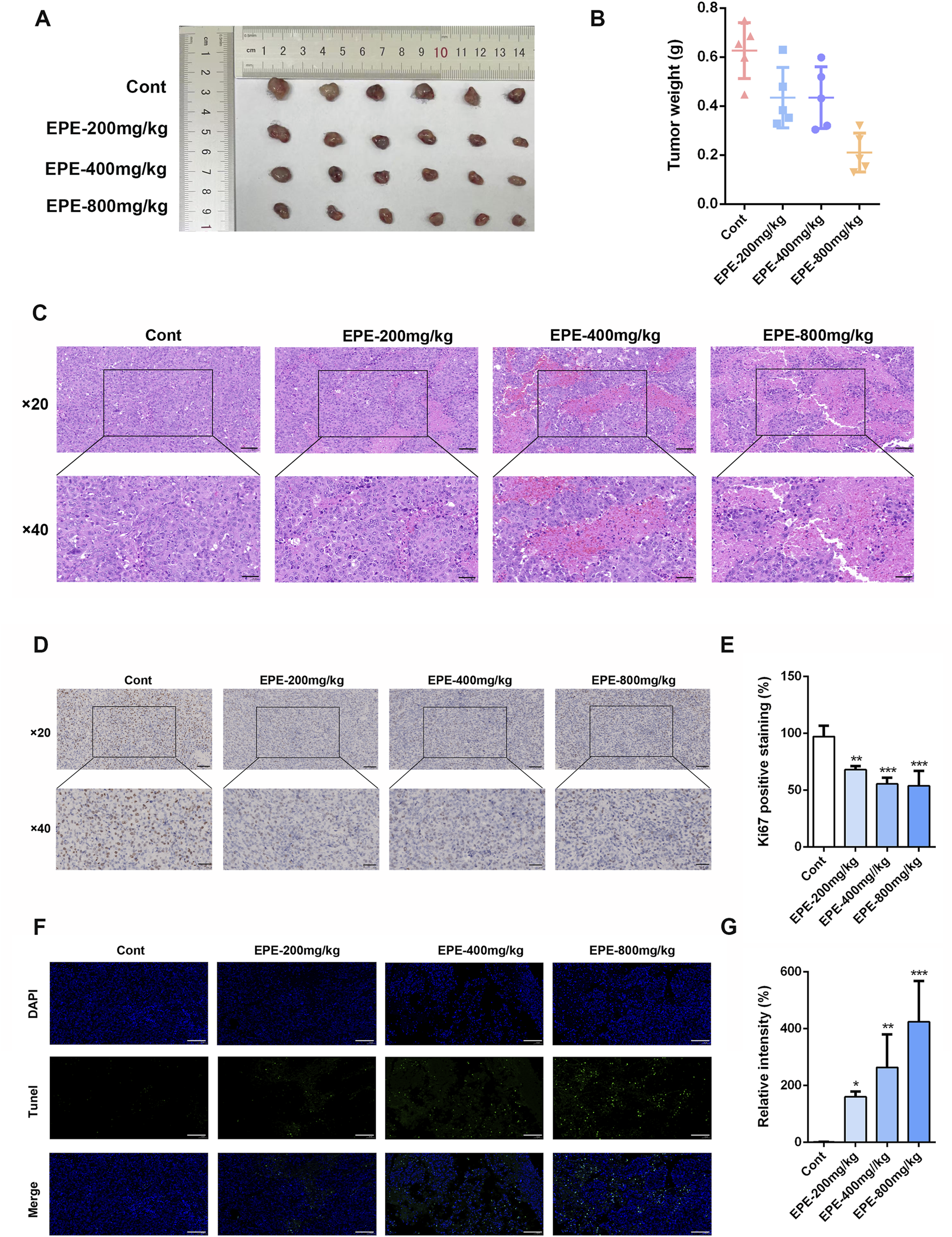 EPE can inhibit the growth of HCC. (A) Mice were sacrificed 1 month after subcutaneous inoculation with 2 × 10^6 Hepa-1-6 cells. Representative appearance of mouse tumors following intervention with EPE (0, 200, 400, 800 mg/kg). Scale bar = 20 μM or 50 μM. (B) Tumor weight of mice in each intervention group. (C) Representative pathological images of tumors in mice from each intervention group. (D) Representative Ki67 staining images of tumors in mice from the EPE intervention group and the non-intervention group. The darker the brown color, the higher the cell proliferation. Scale bar = 20 μM or 50 μM. (E) The quantification of Ki67 expression using ImageJ Pro Plus. (F) Representative Tunel staining images of tumors in mice from the EPE intervention group and the non-intervention group. Scale bar = 20 μM. (G) The quantification of Tunel using Image J. Data are represented as mean ± SEM. n = 5. ∗p < 0.05, ∗∗p < 0.01, ∗∗∗p < 0.001.