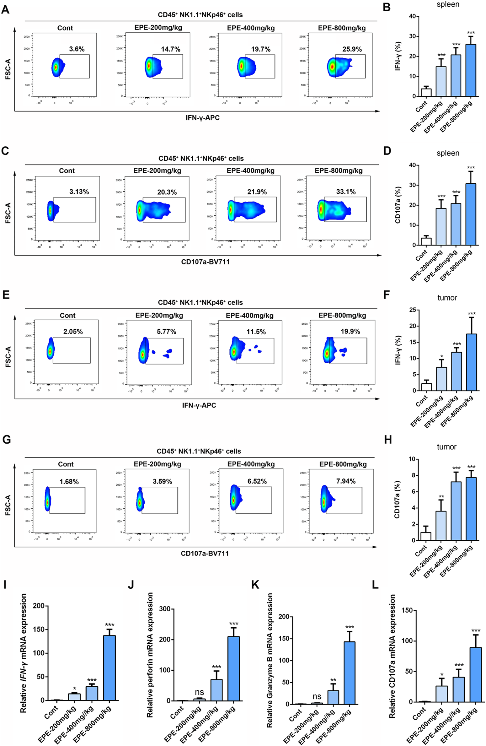 EPE regulates NK cell function to resist HCC. (A–D) Flow cytometry analysis of NK cell IFN-γ (A) and CD107a (C) expression in spleen tissue of tumor-bearing mice. Numbers adjacent to outlined areas indicate percent the mean fluorescence intensity of IFN-γ, CD107a. Quantitative analysis of IFN-γ (B) and CD107a (D) levels in NK cell. (E–H) Flow cytometry analysis of NK cell IFN-γ (E) and CD107a (G) expression in tumor tissue of tumor-bearing mice. Quantitative analysis of IFN-γ (F) and CD107a (H) levels in NK cell. (I–L) qRT-PCR analysis of IFN-γ, Perforin, Granzyme B and CD107a mRNA levels in tumor tissue were measured. Data are represented as mean ± SEM. n = 5. ∗p < 0.05, ∗∗p < 0.01, ∗∗∗p < 0.001.