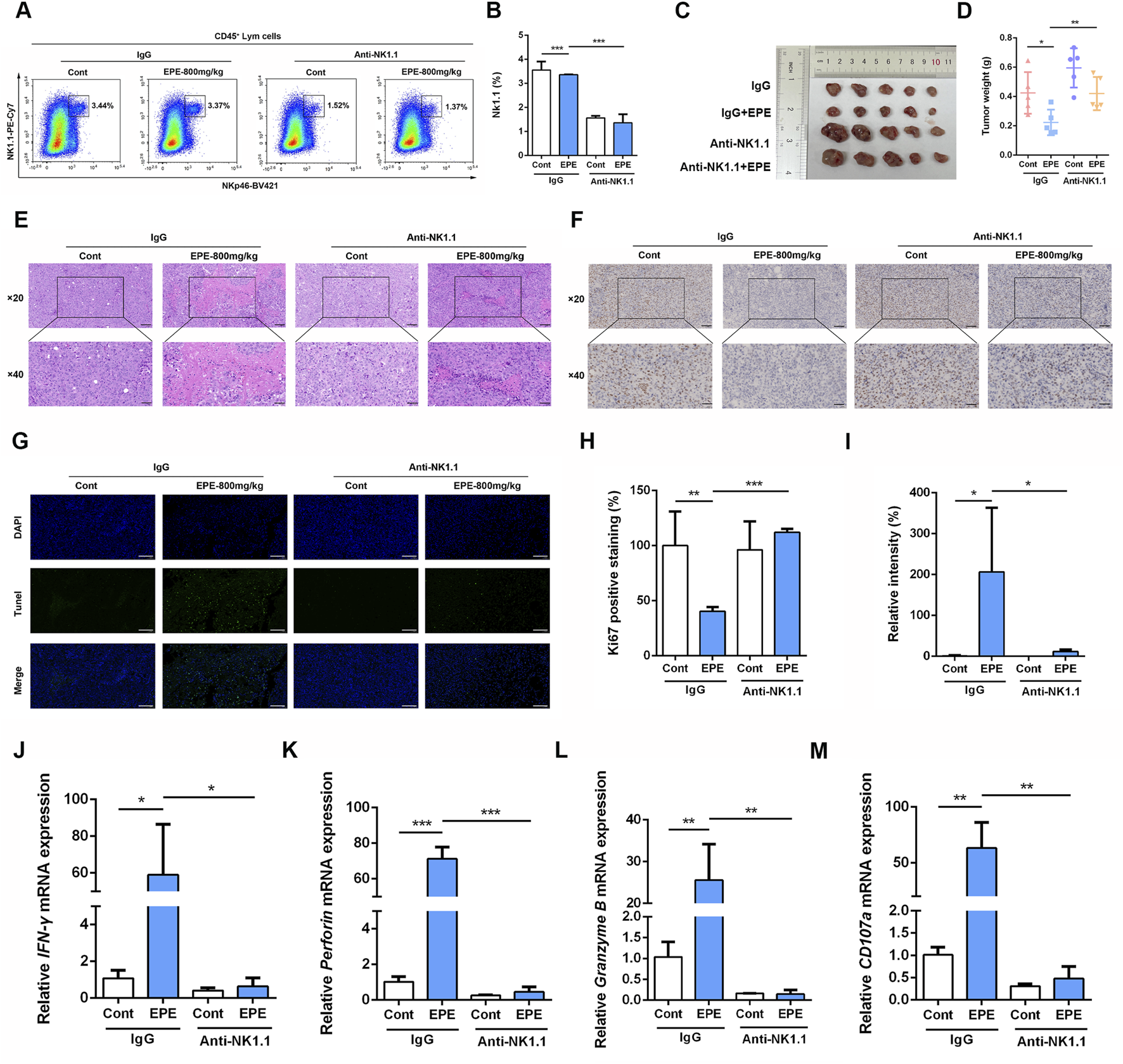The inhibitory of EPE on HCC is weakened by NK1.1 cell depletion. (A) Beginning on day 3 after subcutaneous Hepa-1-6 tumor cell implantation, 250 µg of Asialo GM1 Polyclonal Antibody, Functional Grade eBioscience™ was administered intraperitoneally every 3 days for a total of three injections. After continuous administration for 1 month, the mice were sacrificed. The amount of NK1.1 cells in tumor tissue were measured using flow cytometry. (B) The quantification of NK1.1 cells in tumor tissue. n = 3. (C) Representative images of tumor in IgG group, IgG plus EPE (800 mg/kg) group, Anti-NK1.1 group and Anti-NK1.1 plus EPE (800 mg/kg) group. (D) The analysis of tumor weight is showed. (E) Representative images of H&E sections of tumor in each group. Scale bar = 20 μM or 50 μM. (F) Representative Ki67 staining images of tumors in each group. Scale bar = 20 μM or 50 μM n = 5. (G) Representative Tunel staining images of tumors in each group. Scale bar = 20 μM. (H) The quantification of Ki67 positive expression was measured by ImageJ Pro Plus. n = 5. (I) The quantification of Tunel positive expression was measured by Image J. n = 5. (J–M) qRT-PCR analysis of IFN-γ, Perforin, Granzyme B and CD107a mRNA levels in tumor tissue were measured. n = 3. Data are represented as mean ± SEM. ∗p < 0.05, ∗∗p < 0.01, ∗∗∗p < 0.001.
