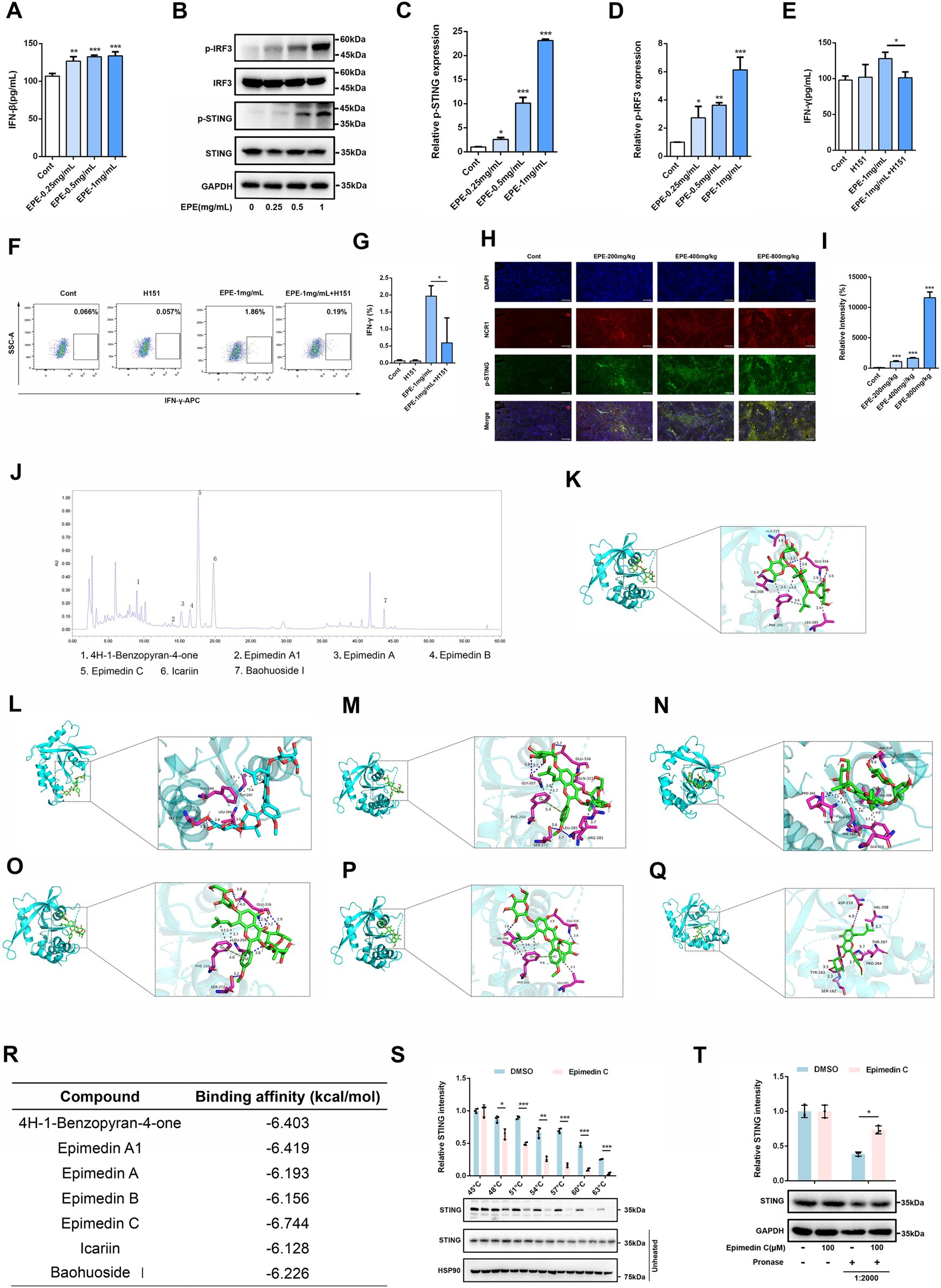 EPE activates NK cell via activating cGAS-STING signaling pathway. (A) Elisa analysis of IFN-β levels in NK-92 cells treated with EPE (0, 0.25, 0.5,1 mg/mL) for 24 h. n = 3. (B) NK-92 cells were untreated or treated with EPE (0.25, 0.5,1 mg/mL) for 24 h. The expression p-IRF3, IRF3, p-STING, STING was measured using Western blotting. GAPDH as an internal reference. (C,D) The quantitative results of the ratio of p-STING and p-IRF3 normalized to their respective total proteins are shown. n = 3. (E) Elisa analysis of IFN-γ in NK-92 cells treated with EPE (1 mg/mL), H151 (10 μM) or EPE (1 mg/mL) plus H151 (10 μM) for 24 h. n = 3. (F) Flow cytometry analysis of IFN-γ in NK-92 cells treated with EPE (1 mg/mL), H151 (10 μM) or EPE (1 mg/mL) plus H151 (10 μM) for 18 h followed by an additional 6 h treatment with monensin solution. Numbers adjacent to outlined areas indicate percent the mean fluorescence intensity of IFN-γ. (G) The quantification of IFN-γ expression in NK-92 cells. n = 3. (H) Representative immunofluorescence image of p-STING expression in NK cell of tumor tissues. Blue fluorescence represents the cell nucleu, red fluorescence represents NK cell and green fluorescence represents the p-STING protein (I). The quantification of p-STING in NK cell of tumor tissue using Image J. Data are represented as mean ± SEM. n = 5. (J) The compounds of EPE was analyzed by HPLC. (K–Q) The binding mode of 4H-1-Benzopyran-4-one, Epimedin A1, Epimedin A, Epimedin B, Epimedin C, Icariin, Baohuoside Ⅰand STING was simulated by molecular docking. (R) The binding energy of 4H-1-Benzopyran-4-one, Epimedin A1, Epimedin A, Epimedin B, Epimedin C, Icariin, Baohuoside Ⅰand STING protein was showed in table. (S) Epimedin C (100 μM) was incubated with the total protein of NK-92 cells, and then the effect of Epimedin C on the thermal stability of STING was analyzed by CETSA assay. n = 3. (T) The Epimedin C (100 μM) was preincubated with total protein of NK-92 cells, DARTS assay was used to measure the effect of Epimedin C on digestive ability of STING resist pronase. n = 3. ∗p < 0.05, ∗∗p < 0.01, ∗∗∗p < 0.001.