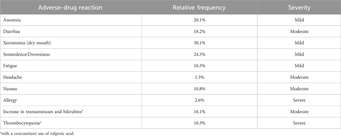 Table 1. Adverse-drug reactions to cannabidiol (adapted from (Lattanzi et al., 2018; McNamara et al., 2020; Zilmer and Olofsson, 2021; Navarro, 2024).