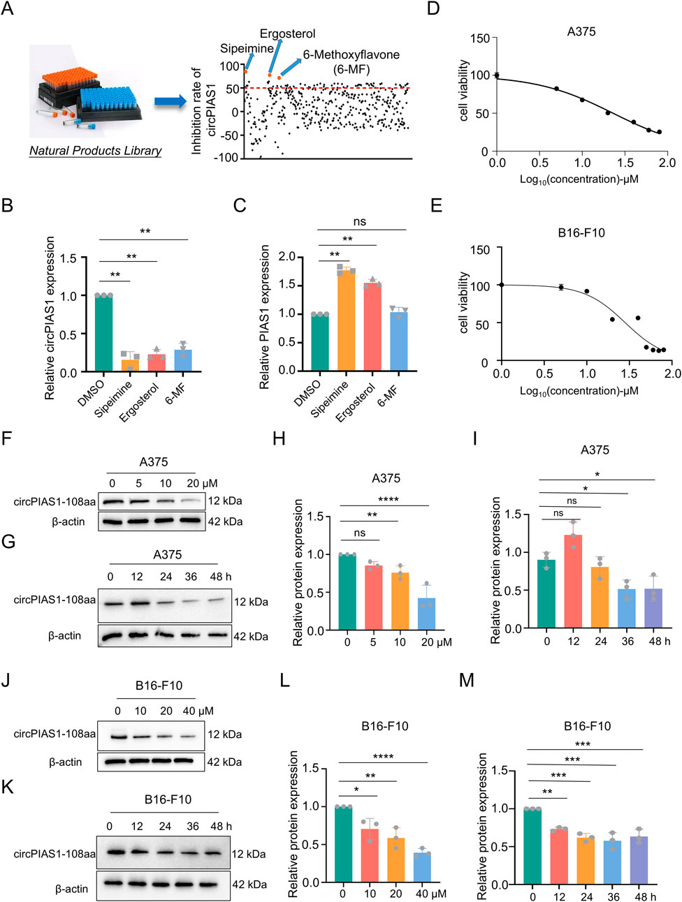 Figure 1. The natural product 6-MF shows the inhibitory effect on the proliferation of melanoma cells and circPIAS1. (A,B) Out of 128 drug candidates, three drugs that can reduce circPIAS1 were identified using the qRT-PCR method (n = 3 independent experiments). (C) The qRT-PCR method identified 6-MF as a metabolite that can inhibit circPIAS1 without affecting its host genes. (D,E) CCK-8 assay on A375 and B16-F10 cells under 5 μM–100 μM 6-MF conditions. Five thousands cells were cultured in 96-well plates for 48 h, and then absorbance at 450 nm was determined to obtain an inhibitory effector dose-effect curve with IC50 values. (F) Western blot analysis of circPIAS1-108aa in A375 cells after 48 h treated with different concentrations of 6-MF. β-ACTIN was used as an internal control (n = 3 independent experiments). (G) Western blot analysis of circPIAS1-108aa in A375 cells treated with 6-MF at a concentration of 20 μM at different times. β-ACTIN was used as an internal control (n = 3 independent experiments). (H,I) The relative protein levels of circPIAS1-108aa were analyzed in A375 cells following the addition of 6-MF at various concentrations and time points (n = 3 independent experiments). (J) Western blot analysis of circPIAS1-108aa in B16-F10 cells after 48 h treated with different concentrations of 6-MF. β-ACTIN was used as an internal control (n = 3 independent experiments). (K) Western blot analysis of circPIAS1-108aa in B16-F10 cells treated with 6-MF at a concentration of 20 μM at different times. β-ACTIN was used as an internal control (n = 3 independent experiments). (L,M) Relative protein levels of circPIAS1-108aa were assessed by western blot analysis in B16-F10 cells after the addition of 6-MF at different concentrations and time points (n = 3 independent experiments). Data represent three experiments and are expressed as mean ± SD: ns (not significant); *P < 0.05; **P < 0.01 (significant). Data were analyzed by One-way ANOVA (B,C,H,I,L,M) in GraphPad Prism 10.5.0.