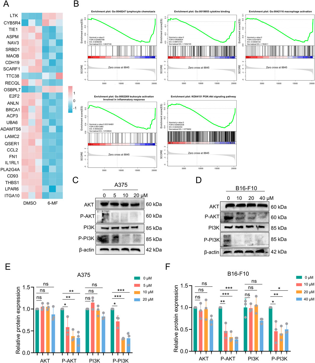 Figure 2. RNA-seq analysis and western blot demonstrate that 6-MF suppresses PI3K-AKT signaling pathway in melanoma cells. (A) RNA-seq screening identified potential genes with significant differences in four gene sets and one pathway in A375 cells. (B) RNA-Seq analysis comparing KEGG pathway analysis and GO analysis enrichment of A375 cells (negative control and 6-MF groups, the concentration of 6-MF was 20 μM) identified 4 gene sets and 1 pathway (n = 3 independent experiments). (C,D) Western blot analysis of the PI3K-AKT signaling pathway in A375 and B16-F10 cells after 48 h treated with different concentrations of 6-MF. β-ACTIN was used as an internal control (n = 3 independent experiments). (E,F) Relative protein levels of AKT, P-AKT, PI3K, and P-PI3K were analyzed and assessed after the addition of different concentrations of 6-MF (n = 3 independent experiments). Data are representative of three experiments and are expressed as mean ± SD. ns (not significant), *P < 0.05, and **P < 0.01 (significant). Data were analyzed by One-way ANOVA (E,F) in GraphPad Prism 10.5.0.