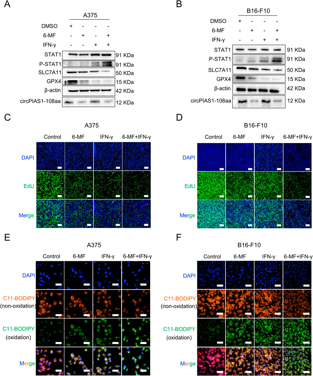 In previous studies, circPIAS1-108aa was found to reactivate the SLC7A11/GPX4 pathway by inhibiting phosphor-STAT1 (P-STAT1), and IFN-γ was found to enhance STAT1 phosphorylation, thereby inhibiting downstream transduction of the SLC7A11/GPX4 signaling, ultimately triggering immunogenic ferroptosis in cancer cells (Zang et al., 2024; Gao et al., 2025; Wu et al., 2023; Yi et al., 2020). The validation of this pathway was conducted using 6-MF and IFN-γ (Figures 3A,B; Supplementary Figure S1A,B). The treatment of 6-MF upregulated P-STAT1 levels. Besides, the stimulation with IFN-γ increased more P-STAT1 expression. Furthermore, the combination of 6-MF and IFN-γ led to the highest P-STAT1 levels. It was determined that the SLC7A11/GPX4 axis was a key downstream target of STAT1 (Yu et al., 2023). The protein levels of SLC7A11 and GPX4 were downregulated by 6-MF, IFN-γ or their combination in A375 and B16-F10 melanoma cells, indicating that ferroptosis might be induced in the presence of these therapeutic strategies. The EdU and lipid ROS assays confirmed that 6-MF decreased cell proliferation (Figures 3C,D; Supplementary Figure S1C) and increased oxidative reactions (Figures 3E,F; Supplementary Figure S1D), with IFN-γ having a stronger effect. The combination of 6-MF and IFN-γ exhibited the most potent inhibitory effect on proliferation and the strongest oxidative stress. The results of the present study demonstrate that the combination of 6-MF and IFN-γ can induce the ferroptosis of melanoma cells.