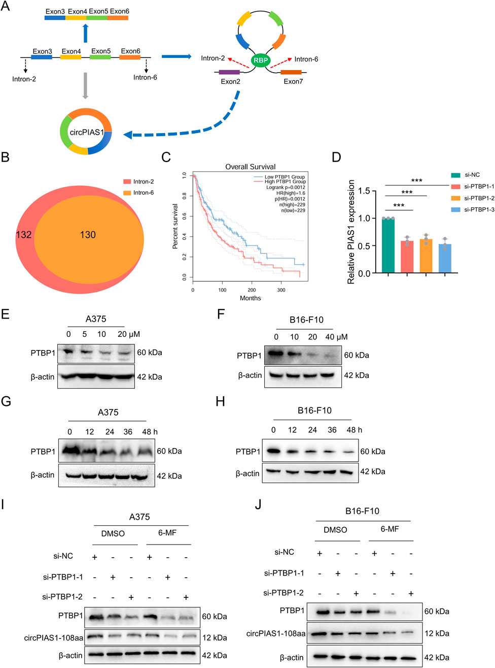 Figure 4. Six-MF blocks circPIAS1 biogenesis by reducing the expression levels of PTBP1. (A) CircPIAS1 is generated by the reverse splicing of PIAS1 exons 3 to 6. RBPs help to bind together introns 2 and 6, and promote the loop formation of exons 3 to 6. (B) Using RBPmap database, 130 RBPs were predicted to bind to both intron 2 and intron 6 of the PIAS1 parent gene. (C) The melanoma patients with higher PTBP1 expression had a shorter overall survival (OS) compared to patients with lower PTBP1. (D) The knockdown efficiency of circPIAS1 in A375 cells transfected with PTBP1-targeting siRNA for 48 h was detected by qRT-PCR (n = 3 independent experiments). (E,F) Western blot experiments were performed to investigate the effect of adding different concentrations of 6-MF at 48 h on PTBP1. β-ACTIN was used as an internal control (n = 3 independent experiments). (G,H) Western blot experiments were performed to investigate the effect of adding 20 μM 6-MF at different times on PTBP1. β-ACTIN was used as an internal control (n = 3 independent experiments). (I,J) Western blot experiments were performed to explore the effects of adding siPTBP1 and adding 6-MF at a concentration of 20 μM on PTBP1 and circPIAS1-108aa in A375 and B16-F10 cells. β-ACTIN was used as an internal control (n = 3 independent experiments). Data represent three experiments and are expressed as the mean ± SD. ns (not significant), *P < 0.05, and **P < 0.01 (significant). Data were analyzed by One-way ANOVA (D) in GraphPad Prism 10.5.0.