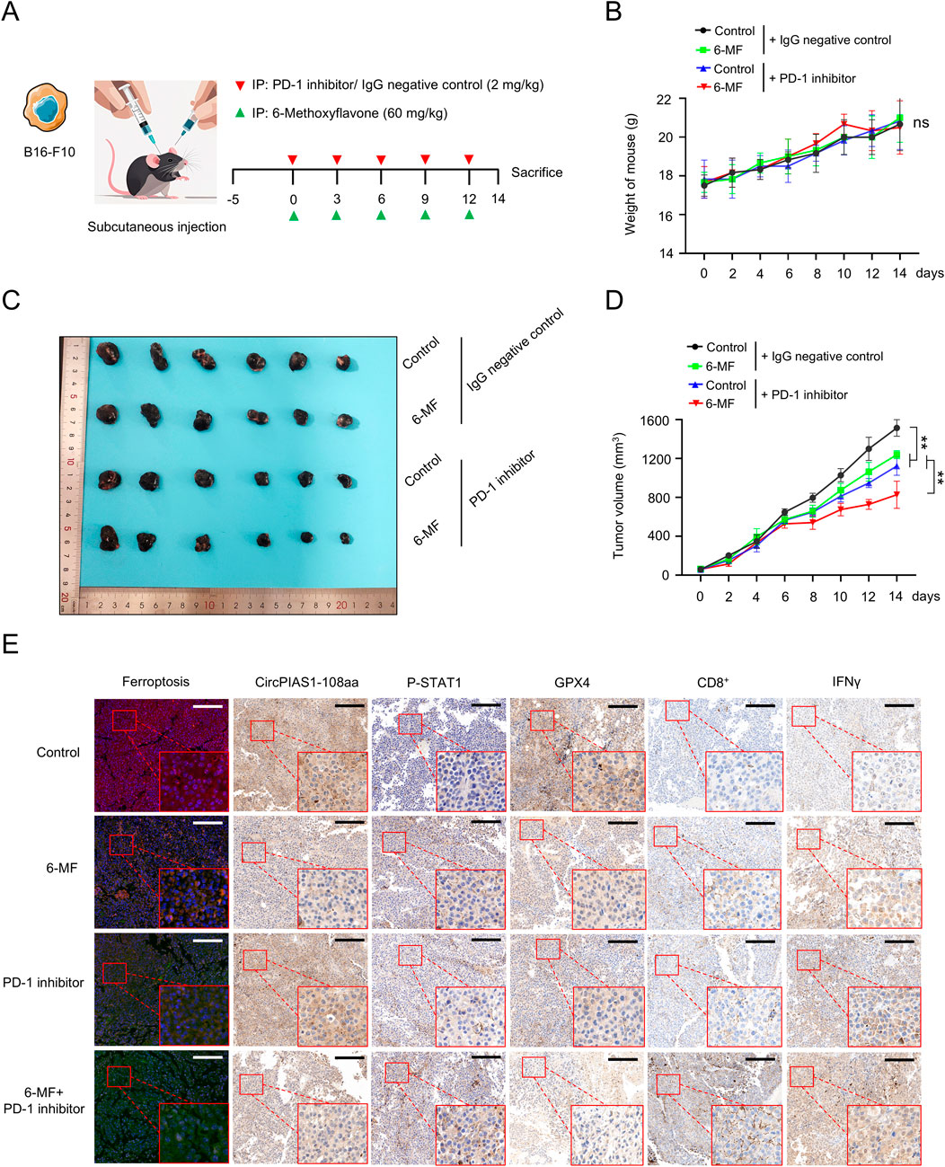 Figure 5. The natural metabolite 6-MF enhances the therapeutic effect of PD-1 inhibitors on melanoma. (A) Melanoma model was created by subcutaneously inoculating B16-F10 cells into C57 BL/6J mice. The mice were divided into four groups when the tumors formed. The groups were as follows: negative control; 6-MF; PD-1 inhibitor; and their combination. The mice were administered the treatment every 3 days for five times, starting from day 0. (6-MF was used at a concentration of 60 mg/kg, and PD-1 inhibitor and IgG negative control at 2 mg/kg). (B) Changes in the body weight of mice in the different treatment groups. The weight was measured every 2 days (n = 6 per group). (C) Melanoma tissues of mice in different treatment groups: negative control; 6-MF; PD-1 inhibitor; and their combination (n = 6 per group). (D) Changes in melanoma volume over time for mice in different treatment groups (n = 6 per group). (E) IHC staining for ferroptosis, circPIAS1-108aa, P-STAT1, GPX4, CD8+, and IFN-γ of melanoma tissues to evaluate various markers. (scale bar: 100 μm) (n = 3 independent experiments). Data were analyzed by One-way ANOVA (B,D) in GraphPad Prism 10.5.0.