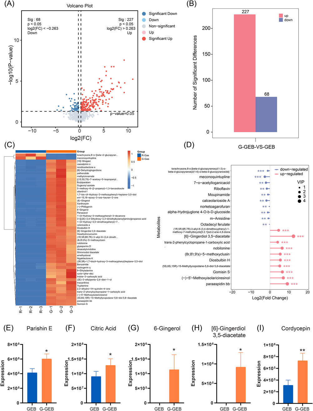 Figure 3. Identification of differential compounds between the GEB and G-GEB groups. (A) Volcano plot illustrated; (B) A bar chart as shown in figure B indicates alterations in the composition of chemical components between GEB and G-GEB; (C) The clustered heatmap in figure C reveals significant differences in the composition and proportion of chemical components between GEB and G-GEB; (D) Lollipop plot based on P-value criteria to count the top ten compounds with altered content between GEB and G-GEB; (E–I) Statistical analysis of peak areas is conducted for Parishin E, Citric Acid, 6-Gingerol, [6]-Gingerdiol 3.5-diacetate, and Cordycepin as depicted in figures (E–I). Data are the mean ± SD of 6 independent experiments. *P < 0.05, **P < 0.01, vs. GEB group.