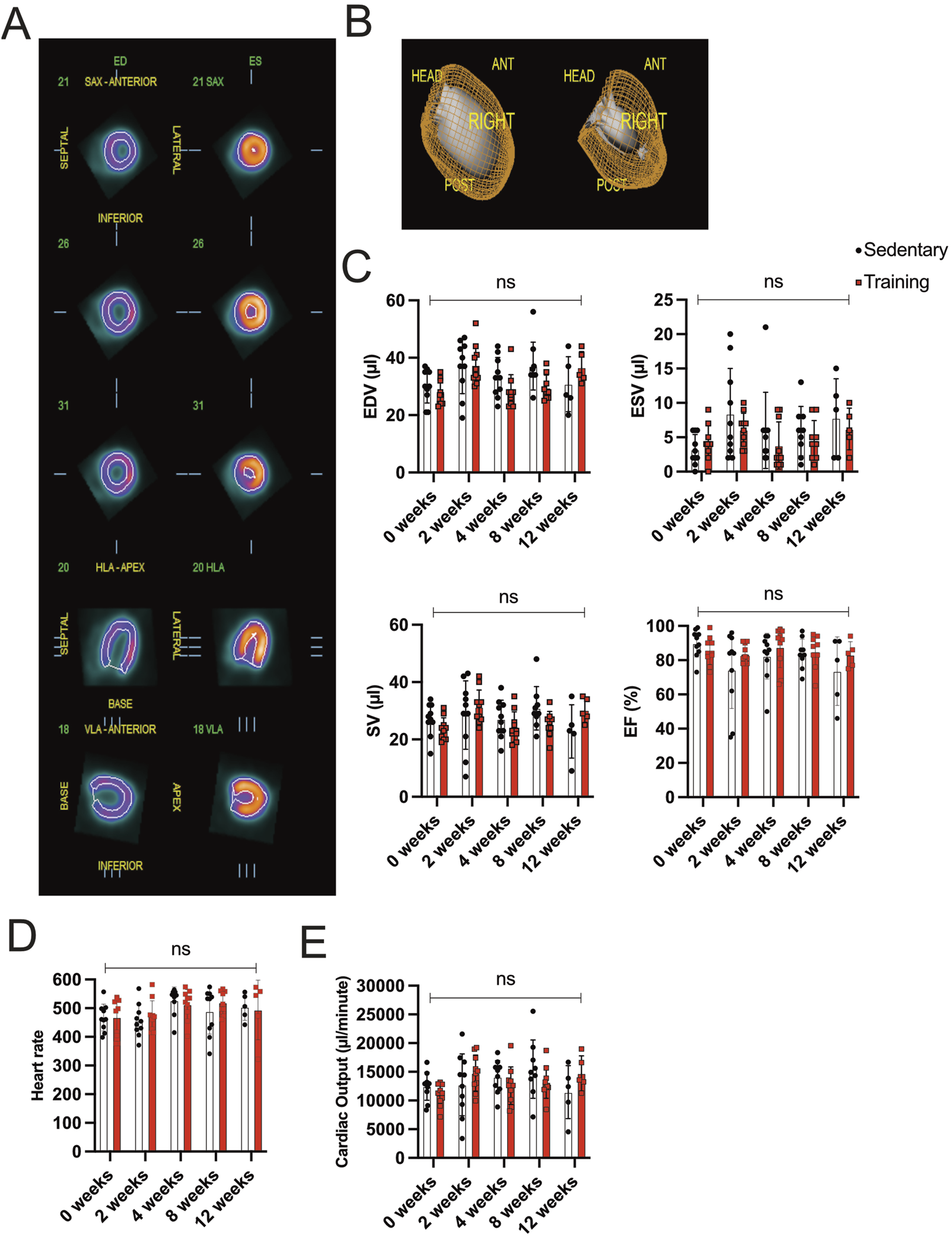 Gated PET/CT assessment of cardiac volume and function (A) Representatives of different views (coronal, horizontal long axis (HLA), and vertical long axis (VLA)) of the left ventricle during end-diastole (ED; left side) and end-systole (ES; right side). (B) Three-dimensional reconstruction of ECG-gated PET/CT images showing the left ventricle in end-diastole (left) and end-systole (right). (C) Evaluation of EDV, ESV, SV, and EF between training and sedentary groups at different time points. (D) Heart rate/minute in training animals compared to their matched sedentary controls. (E) Cardiac output is calculated from SV and heart rate/minute. Data illustrated as mean ± SD. N = 10 mice in each group, except for 12 weeks (n = 5 mice per group). Black dots represent sedentary control; training animals are shown in red. Two-way ANOVA with Turkey’s multiple comparison tests was used. ns = not significant, *p < 0.05, **p < 0.01, ***p < 0.001.