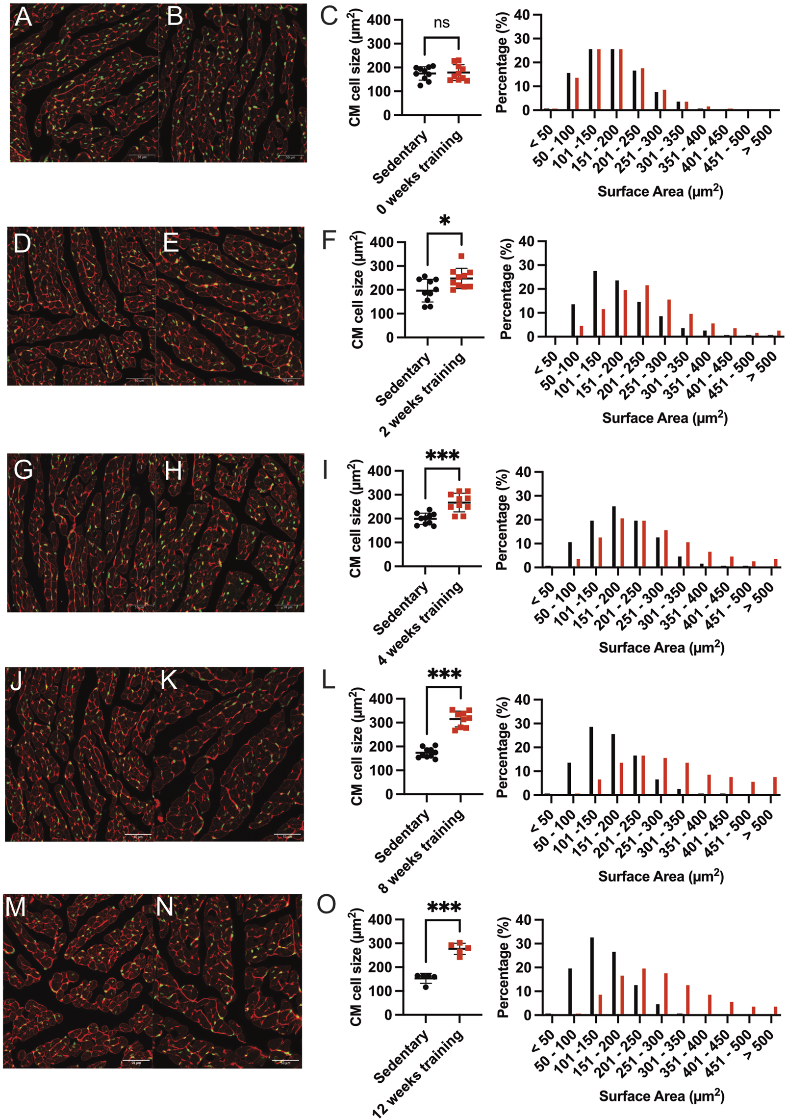 Representative immunofluorescence staining and quantification of induced cardiac hypertrophy. Immunofluorescence images at baseline 0-weeks sedentary control (A) and corresponding training group (B) WGA-Alexa Fluor® 647 (shown in red) and SYTOX green® (shown in green). The length bar represents 50 µm. (C) Quantification of cardiac hypertrophy by cross-sectional CM size (left) and the corresponding percentage of surface area (right) compared with the sedentary controls. Black dots indicated sedentary control mice. Training mice are depicted in red. (D,E) show representative immunofluorescence images after 2 weeks of training and the corresponding quantification illustrated in (F). The 4-week training group is shown in (G–I), and the 8-week training group in (J–L). The 12-week training groups in (M–O). Data illustrated as mean ± SD. N = 10 mice in each group, except for 12 weeks (n = 5 mice per group). Unpaired two-tailed Student’s t-test was used. ns = not significant, *p < 0.05, **p < 0.01, ***p < 0.001.