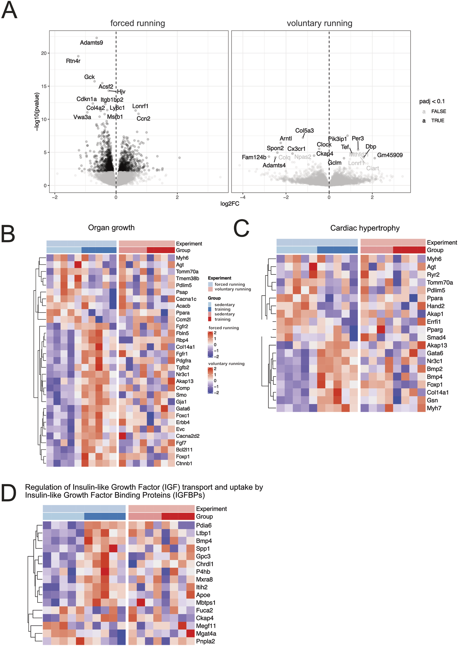 Gene expression analysis of forced and voluntary running models Volcano (A) and heat maps showing differentially expressed genes based on clustered genes annotated in several selected biological processes of organ growth (B). Heat maps related to cardiac hypertrophy (C) and regulating IGF uptake and transport (D) are shown. Only genes considered significantly differentially expressed (False Discovery Rate (FDR) <10%) are included in the analysis.