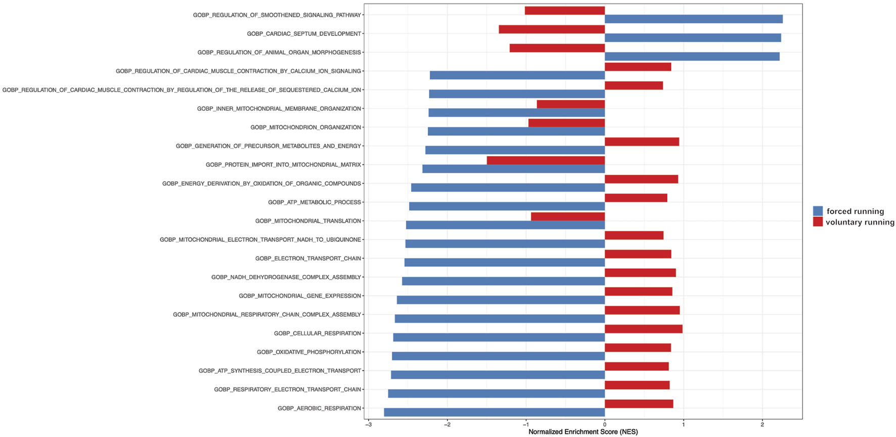 Gene Set Enrichment Analysis (GSEA) of gene ontology gene in forced vs voluntary running for 8 weeks. Gene Set Enrichment Analysis (GSEA) of gene ontology gene sets shows only the most relevant biological processes. The blue color indicates forced running. The red color shows voluntary running.