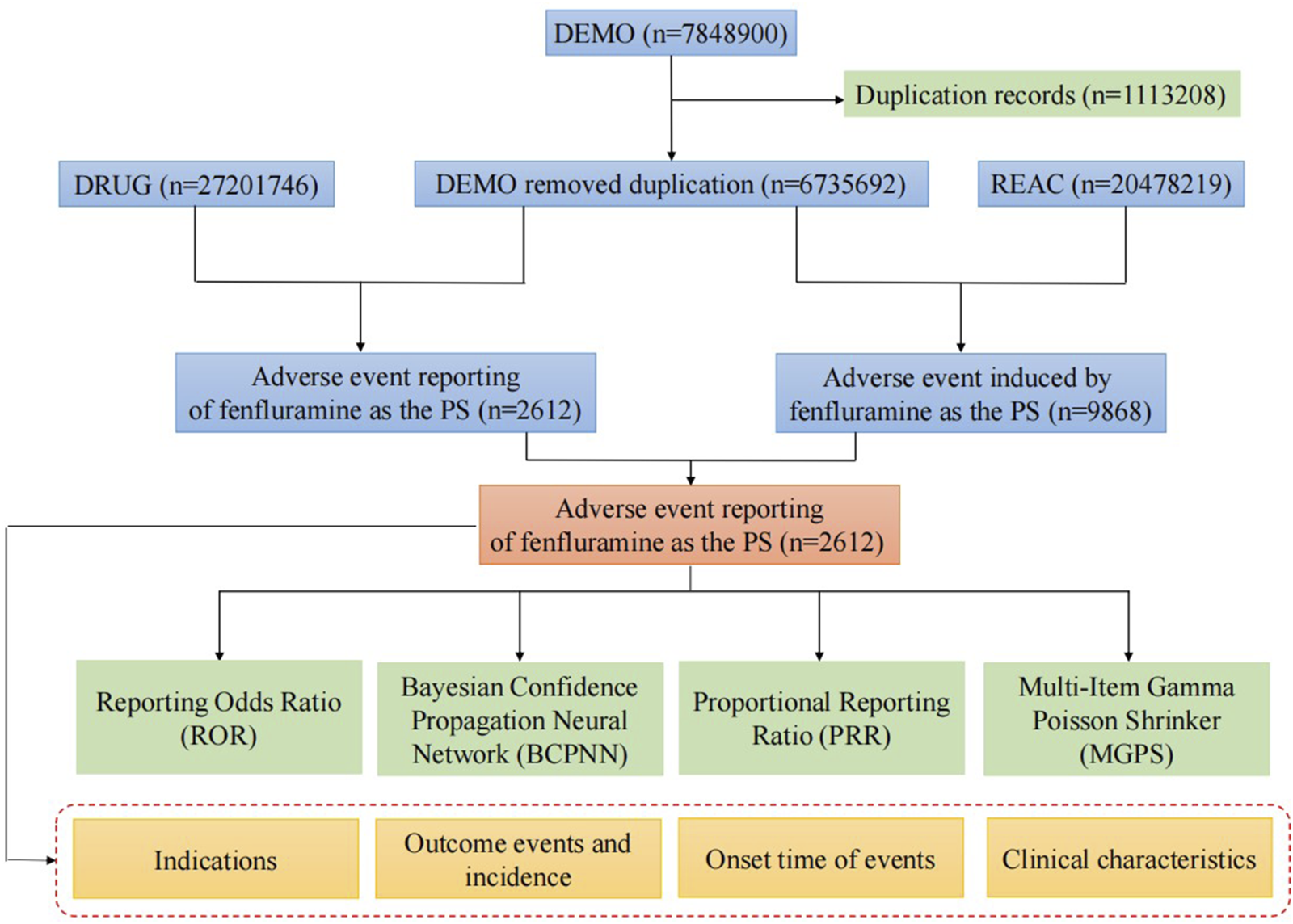 The data were extracted from the Food and Drug Administration (FDA) Adverse Event Reporting System (FAERS) database from the third quarter of 2020 to the fourth quarter of 2024 for data cleaning and analysis. To ensure the accuracy and reliability of the study, adverse events of fenfluramine were analyzed using the Reporting Odds Ratio (ROR), Bayesian Confidence Propagation Neural Network (BCPNN), Proportional Reporting Ratio (PRR), and Multi-Item Gamma Poisson Shrinker (MGPS) methods.