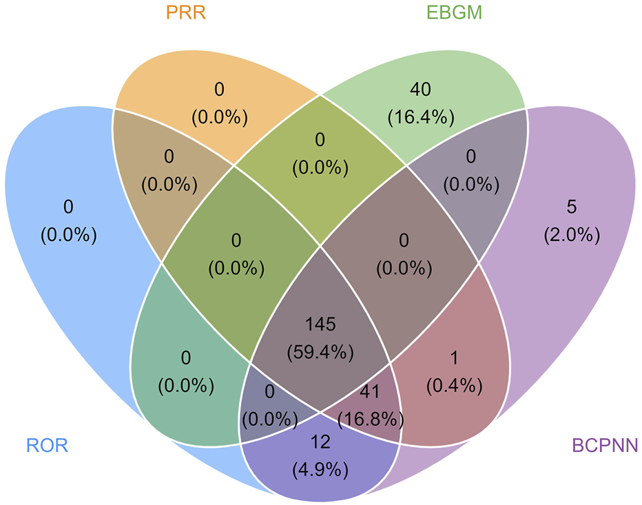 Disproportionality analysis is a useful tool for identifying and detecting drug-related adverse reaction signals in pharmacovigilance studies (van Puijenbroek et al., 2002), and methods with high sensitivity can identify more potential AEs and reduce the likelihood of missing true signals, while methods with high specificity can reduce the proportion of false positive signals (Jiao et al., 2024). To increase the reliability of the results, we used various disproportionality analysis techniques to reduce the bias of false-positive results caused by one method, such as reporting odds ratio (ROR) and proportional reporting ratio (PRR), Bayesian confidence propagation neural network (BCPNN), and multi-item gamma Poisson shrinker (MGPS). A preferred terminology is considered a positive signal if it simultaneously meets the thresholds of all four algorithms, and the equations and criteria for the four algorithms are detailed in Table 1. Data were analyzed using Microsoft Excel 2021 and R 4.3.0.