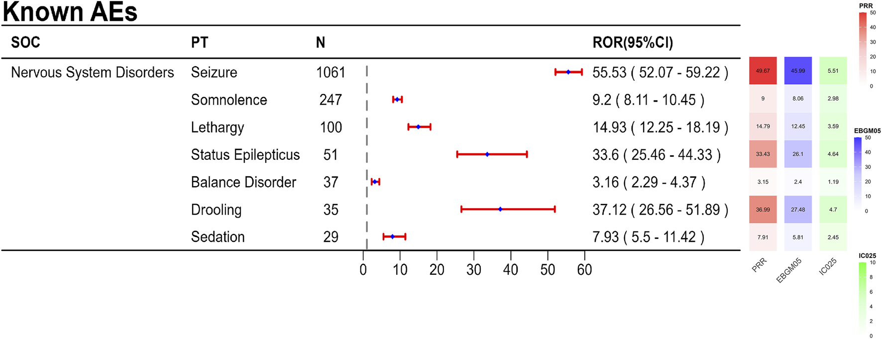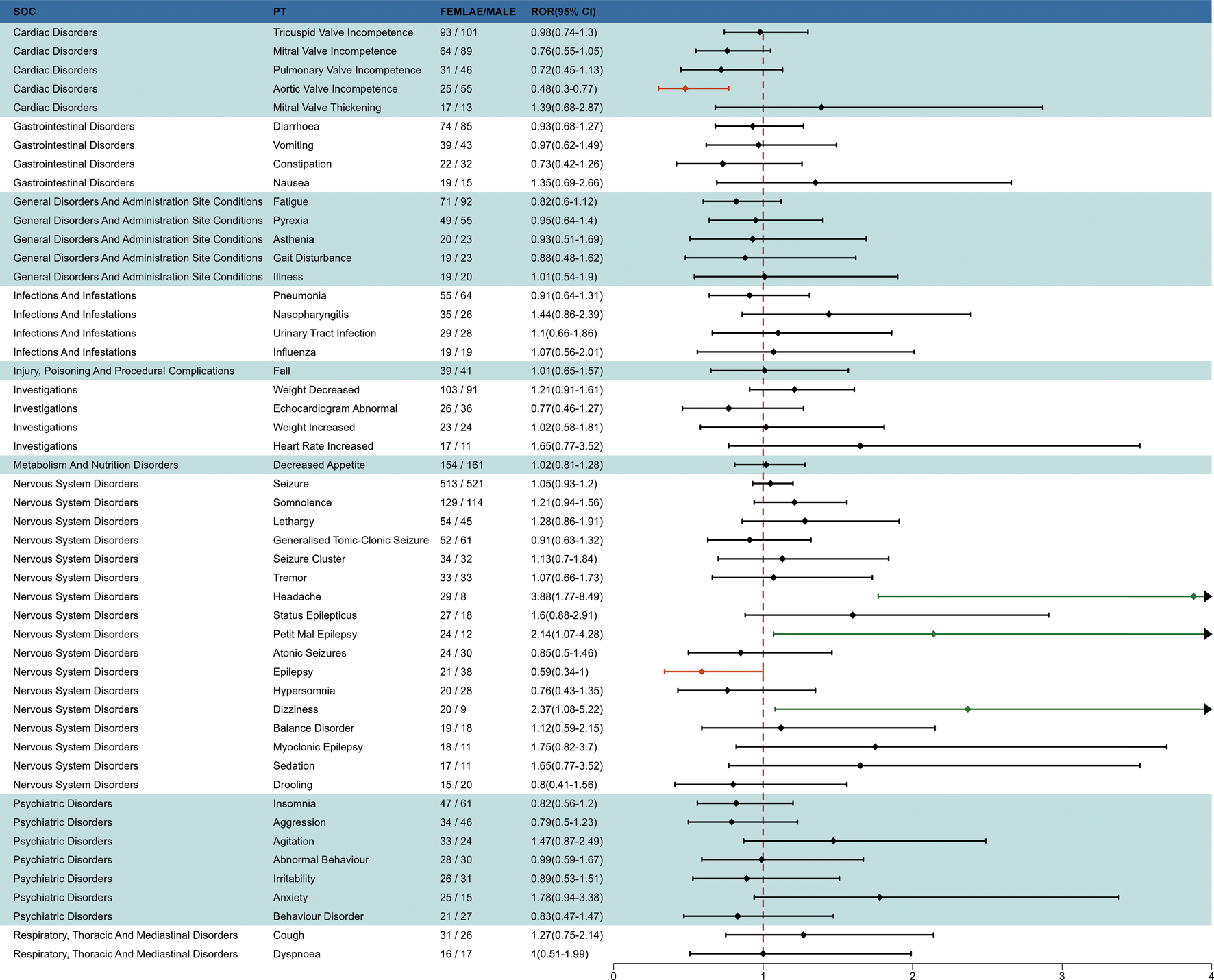 Following data deduplication and screening, a total of 9,868 fenfluramine-related adverse event reports were included in this study. The analysis showed that fenfluramine-induced AEs occurred across 24 system organ classes (SOCs). In addition to the typical side effects such as seizure, somnolence, lethargy, status epilepticus, balance disorder and sedation, it is important to pay attention to emerging risks such as pericardial effusion, crying, pneumonia, oxygen saturation decreased, muscle twitching, insomnia, aggression, agitation, mood swings, urinary retention and aortic dilatation. It is notable that aortic valve incompetence and epilepsy are more likely to occur in males and females are more prone to encountering nervous system adverse reactions after fenfluramine treatment. LGS had higher risk after fenfluramine treatment in mitral valve incompetence, constipation, urinary tract infection, fall, lethargy and atonic seizures, while DS had higher risk in pyrexia, illness, nasopharyngitis, influenza, decreased appetite, seizure, generalized tonic-clonic seizure, status epilepticus, myoclonic epilepsy, aggression.