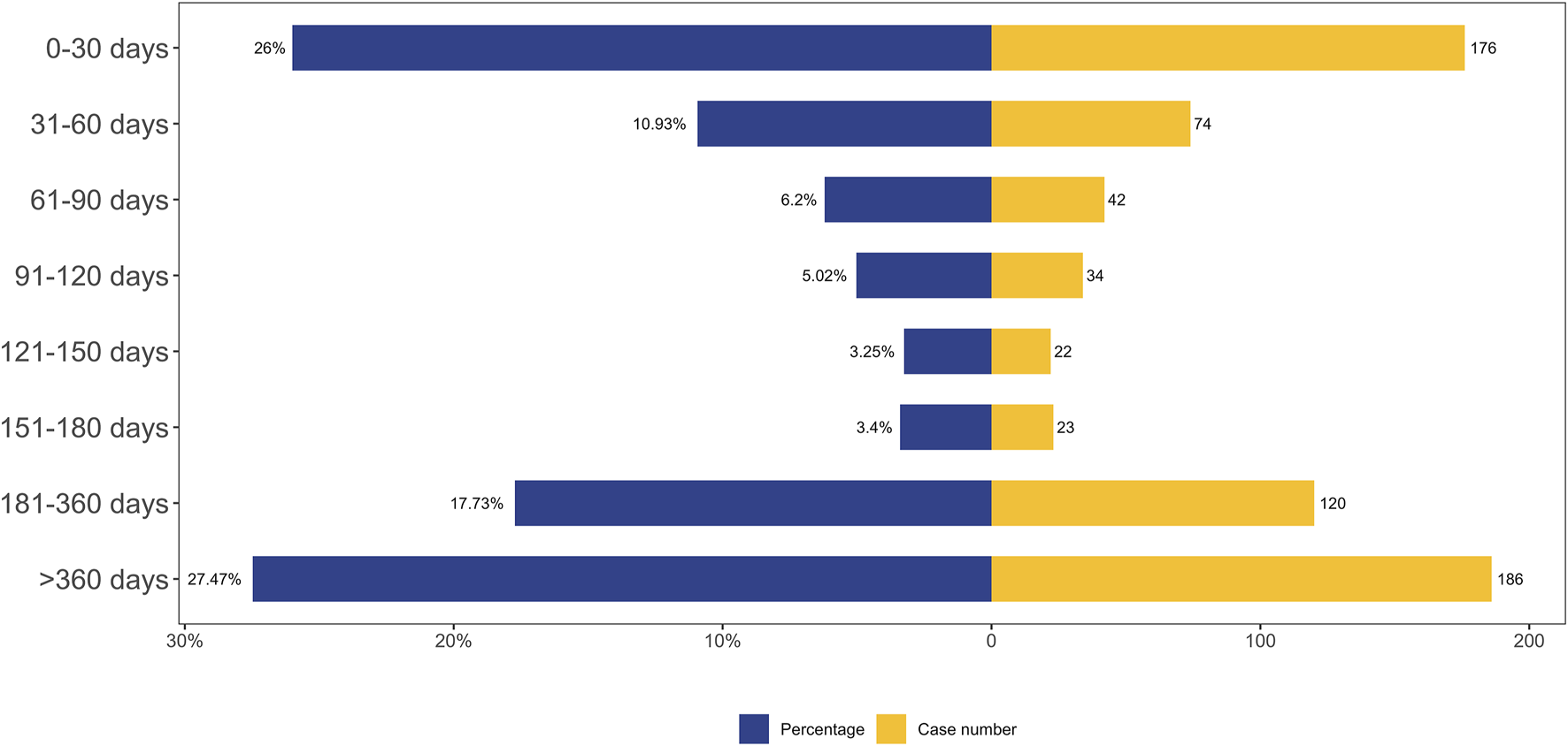The gap between EVENT_DT (the date of ADE onset in the DEMO file) and START_DT (the date of medication commencement in the THER file) was used to calculate the time to onset (TTO) of fenfluramine-related ADEs. Excluded were cases with mistakes (not specific to a day, month, or year) or missing dates (either the start of AEs or the start of treatment). Furthermore, because this would provide a negative time-to-onset computation, instances where the starting date of AEs occurred prior to the start date of fenfluramine medication were also eliminated (Liu et al., 2024). In this work, we measured TTO features using the median, quartile, minimum, maximum, and Weibull shape parameter (Kinoshita et al., 2020).