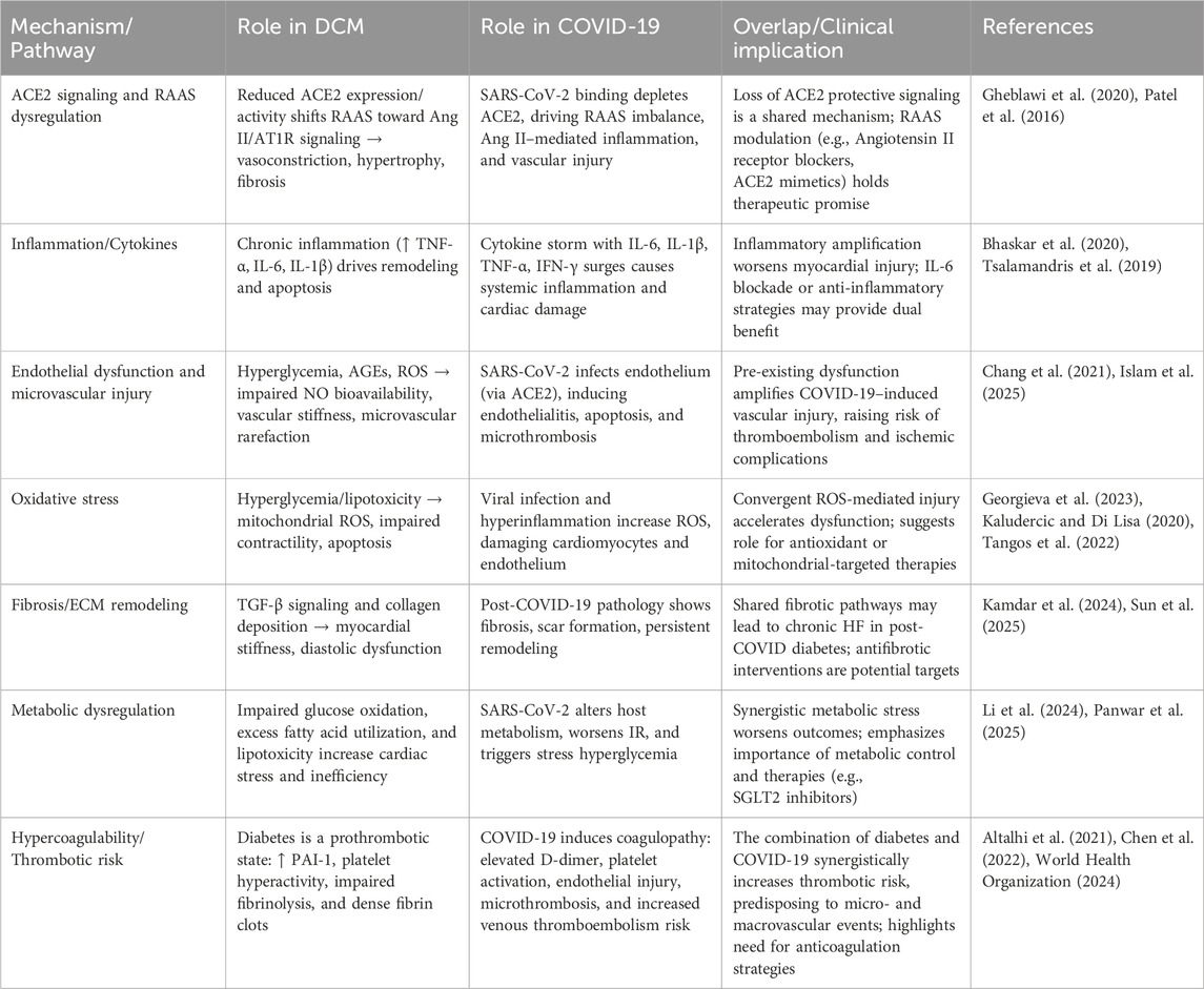 DCM and COVID-19 share overlapping pathogenic mechanisms that exacerbate cardiac injury, including ACE2 downregulation, maladaptive RAAS activation, and heightened inflammation. In diabetes, baseline endothelial vulnerability, impaired NO signaling, and heightened thrombogenicity (Çalışkan et al., 2022; Drakos et al., 2021; Endemann and Schiffrin, 2004; Stockklauser-Färber et al., 2000) are further amplified by SARS-CoV-2–induced inflammation, oxidative stress, and coagulopathy (Gimbrone and García-Cardeña, 2016; Sandoo et al., 2010), creating a “double hit” that predisposes patients to severe cardiovascular complications, multiorgan injury, and higher mortality.