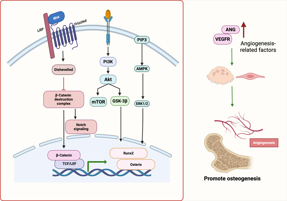 The Wnt/β-catenin and BMPs signaling pathways are two fundamental regulatory axes in osteogenesis. These pathways directly influence osteoblast differentiation, matrix protein expression, and the overall rate and quality of bone formation (Day et al., 2005).