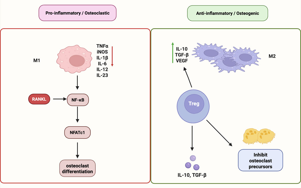 In metabolic bone disorders such as osteoporosis, immune dysregulation is often a central pathogenic factor. A shift toward pro-inflammatory immune phenotypes—such as increased M1-type macrophage infiltration and elevated levels of cytokines like Tumor necrosis factor-alpha (TNF-α) and Interleukin-6 (IL-6)—has been shown to inhibit osteogenesis, stimulate osteoclastogenesis, and ultimately accelerate bone loss (Sun et al., 2021). These cytokines suppress Runx2 differentiation of BMSCs. Likewise, Tregs can suppress excessive immune activation while secreting osteoinductive cytokines and enhancing osteoblast survival.