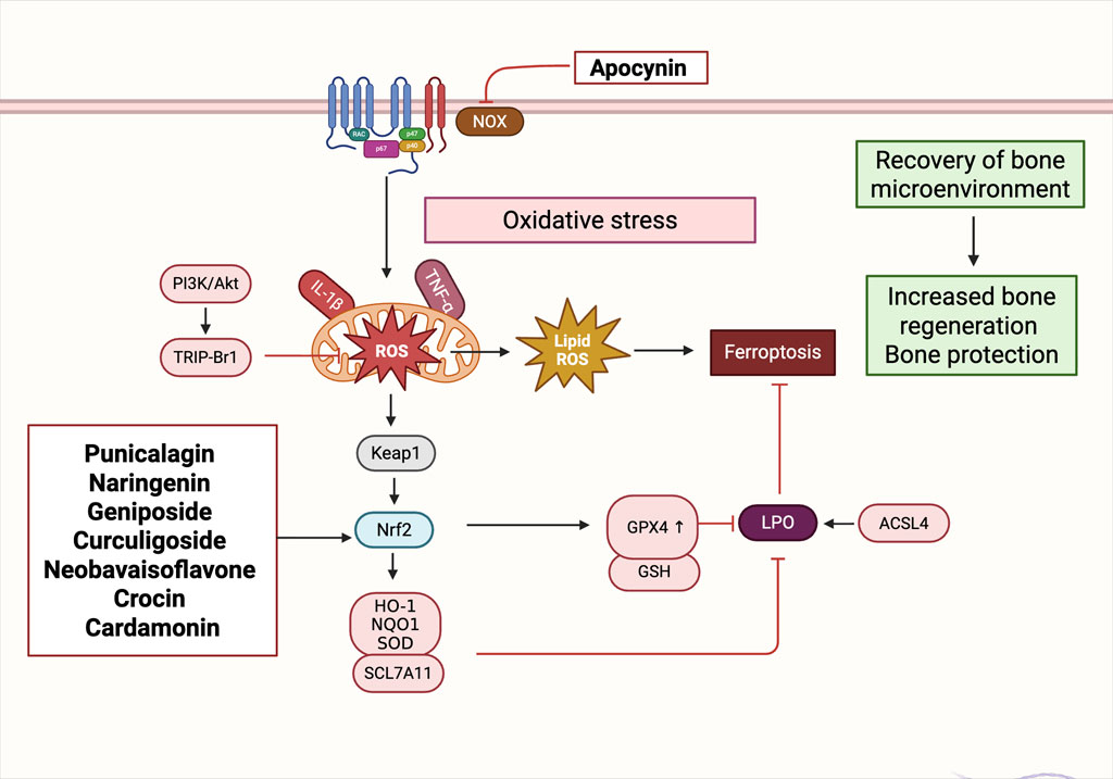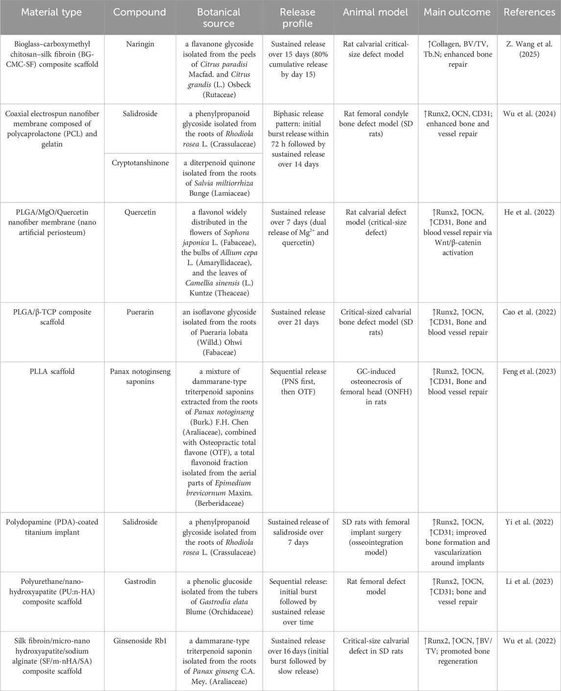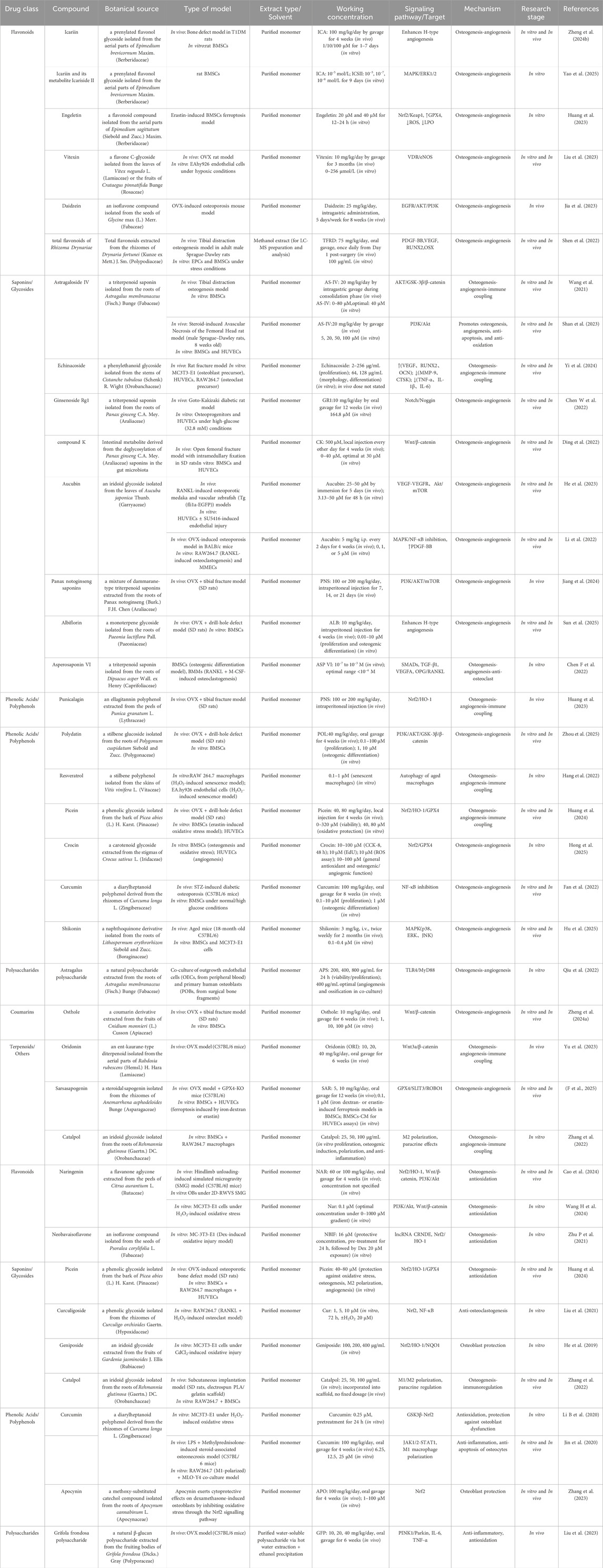 In recent years, natural bioactive products—particularly those derived from traditional botanical drug—have emerged as promising candidates for modulating bone remodeling due to their favorable biocompatibility, low toxicity, and pleiotropic pharmacological activities (Que et al., 2022; Xi et al., 2022). A growing body of evidence suggests that these phytochemicals exert multi-targeted regulatory effects on bone regeneration by modulating key signaling pathways, including Wingless-related integration site (Wnt)/β-catenin, Bone morphogenetic protein (BMP)/mothers against decapentaplegic homolog (Smad), Phosphoinositide 3-kinase (PI3K)/protein kinase B (Akt), and Nuclear factor erythroid 2–related factor 2 (Nrf2)/heme oxygenase-1 (HO-1). These products have been shown to enhance osteoblast differentiation and function, promote angiogenesis, suppress oxidative stress and inflammation, and inhibit osteoclastogenesis—collectively contributing to an improved bone microenvironment and exerting comprehensive osteoprotective effects.