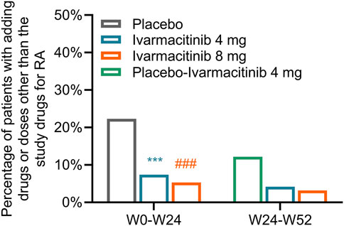 Figure 1. Total incidence of adding/escalating medications within W24 and from W24 to W52. ***: P < 0.001 in ivarmacitinib 4 mg group compared with the placebo group; ###: P < 0.001 in ivarmacitinib 8 mg group compared with the placebo group.