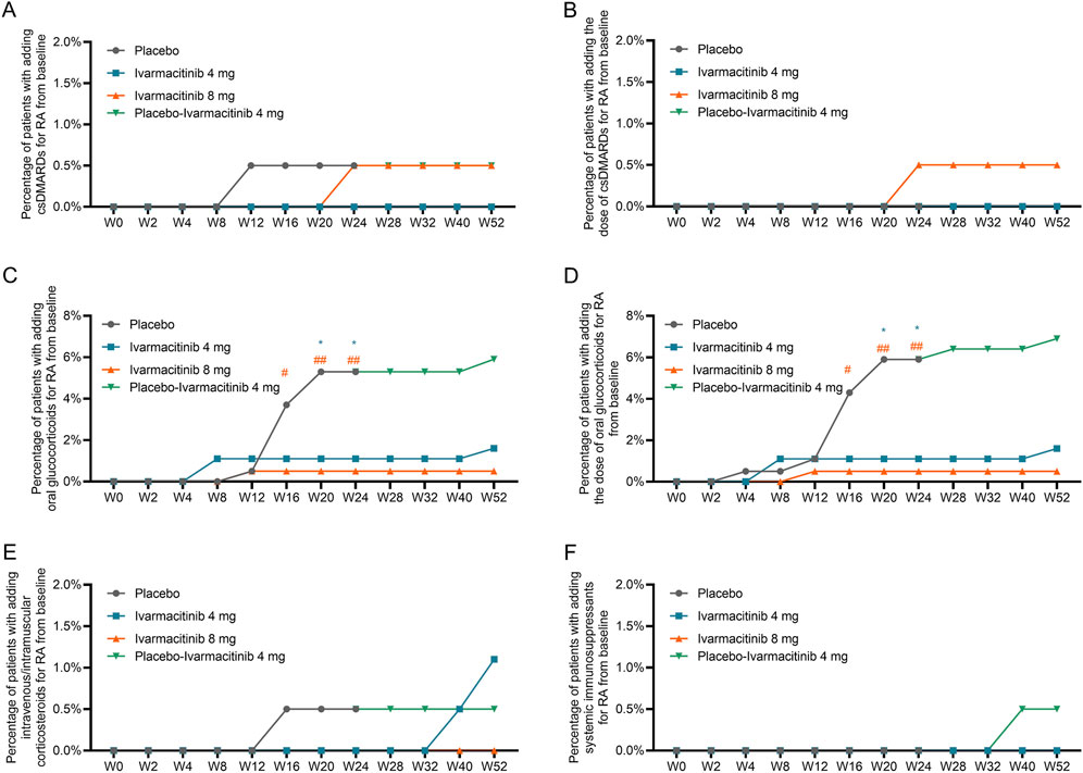 Figure 2. Accumulating incidence of adding/escalating csDMARDs, oral glucocorticoids, and intravenous/intramuscular corticosteroids from W0 to W52. Accumulating incidence of adding csDMARDs (A) and escalating csDMARDs (B). Accumulating incidence of adding oral glucocorticoids (C) and escalating oral glucocorticoids (D). Accumulating incidence of adding intravenous/intramuscular corticosteroids (E) and escalating intravenous/intramuscular corticosteroids (F). *: P < 0.05 in ivarmacitinib 4 mg group compared with the placebo group; #: P < 0.05, ##: P < 0.01 in ivarmacitinib 8 mg group compared with the placebo group.