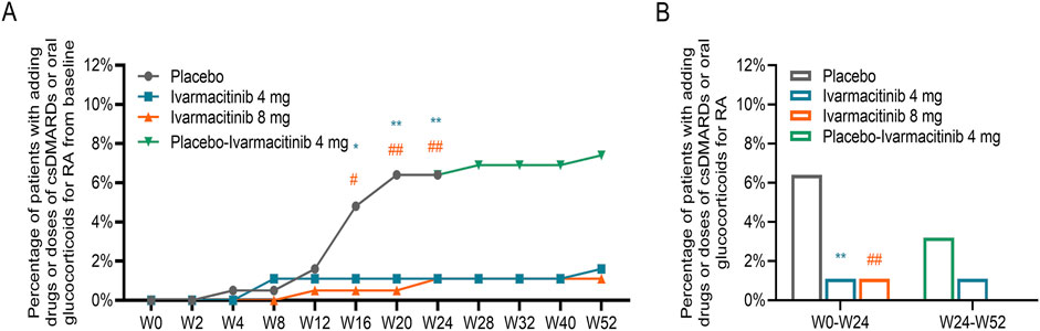 Figure 3. Adding/escalating csDMARDs or oral glucocorticoids. Accumulating incidence of adding/escalating csDMARDs or oral glucocorticoids from W0 to W52 (A). Total incidence of adding/escalating csDMARDs or oral glucocorticoids within W24 and from W24 to W52 (B). *: P < 0.05, **: P < 0.01 in ivarmacitinib 4 mg group compared with the placebo group; #: P < 0.05, ##: P < 0.01 in ivarmacitinib 8 mg group compared with the placebo group.